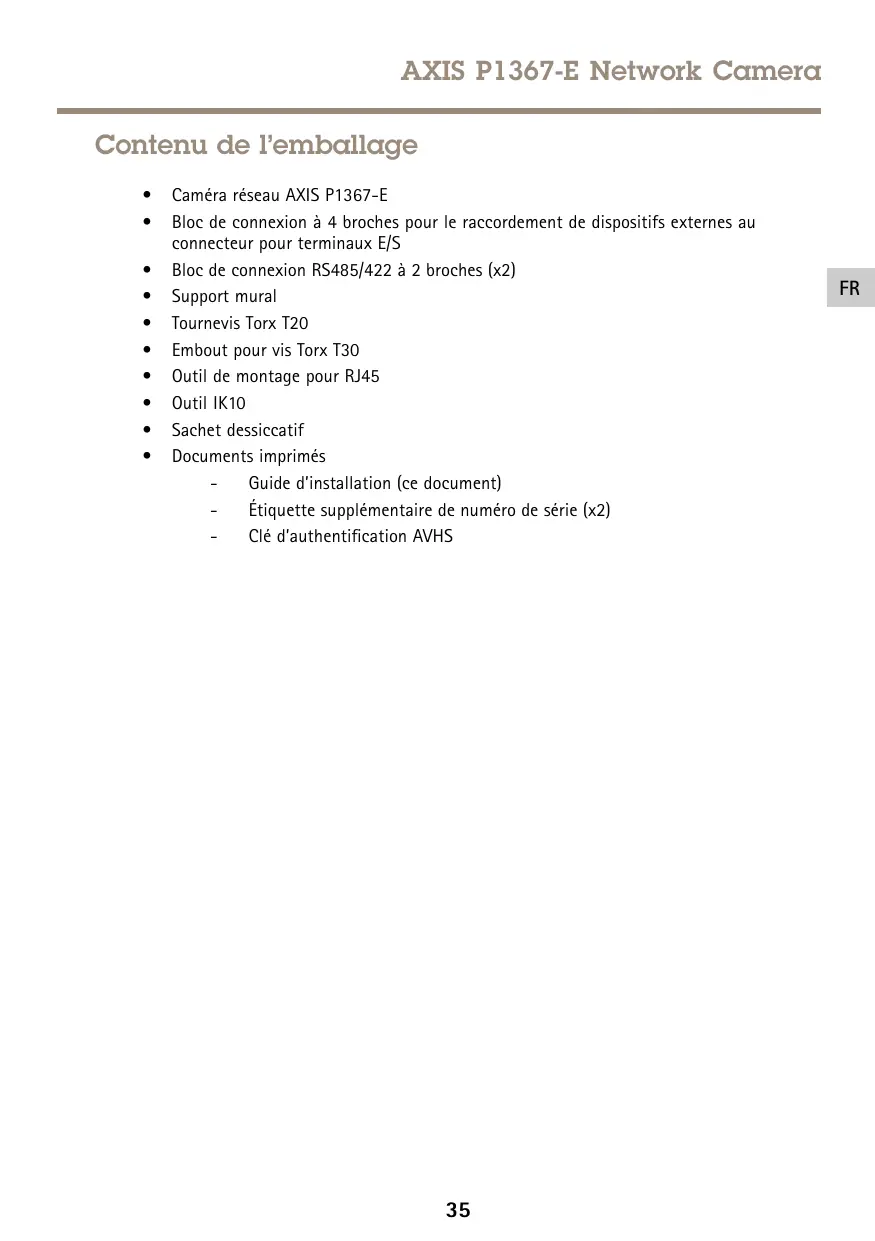 Support mural Tournevis Torx T20 Embout pour vis Torx T30 Outil de montage pour RJ45 Outil IK10 Sachet dessiccatif Documents imprimés Guide d’installation (ce document) Étiquette supplémentaire de numéro de série (x2) Clé d’authentification AVHS