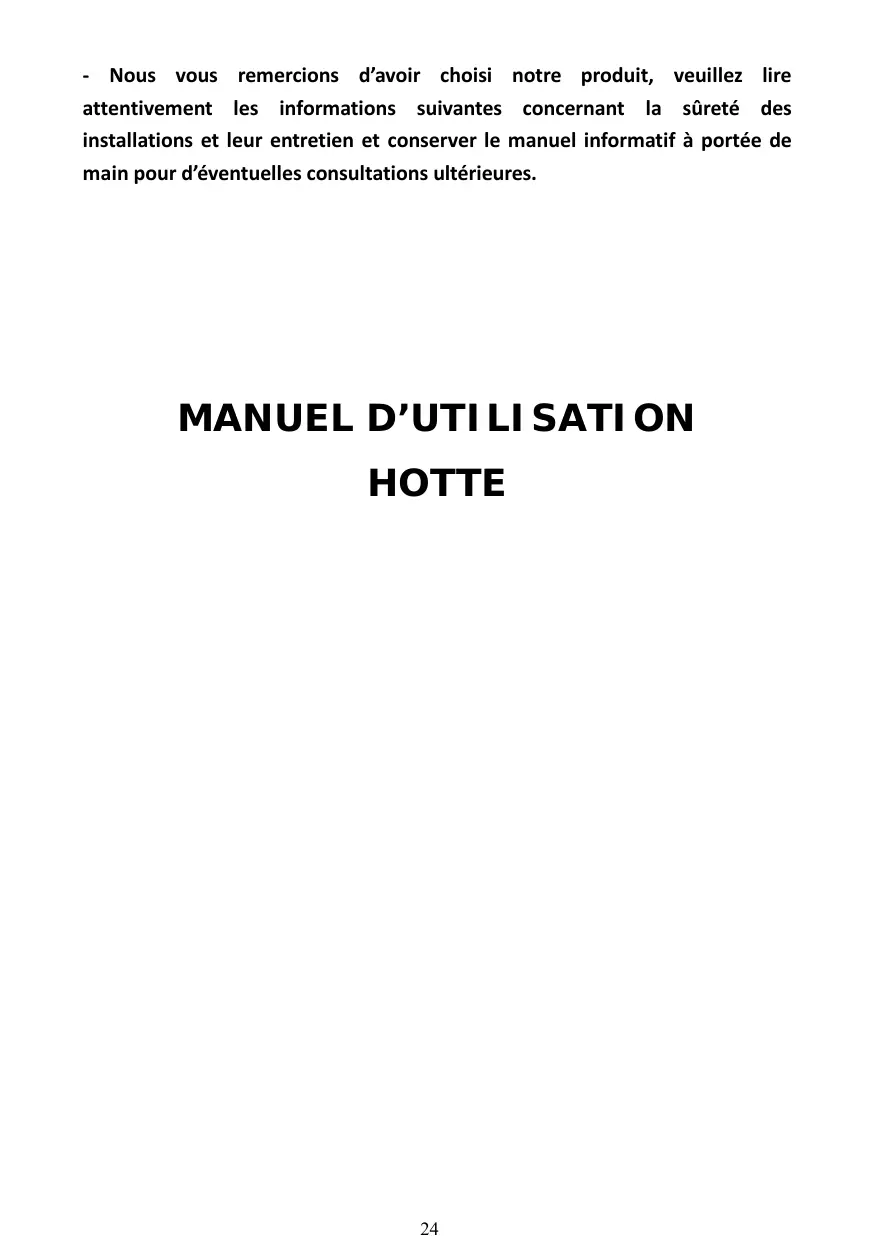 * Veuillez lire le présent manuel d'utilisation avant d'installer et d'utiliser la hotte. Et veuillez garder le manuel d'utilisation en sécurité pour consultation ultérieure.