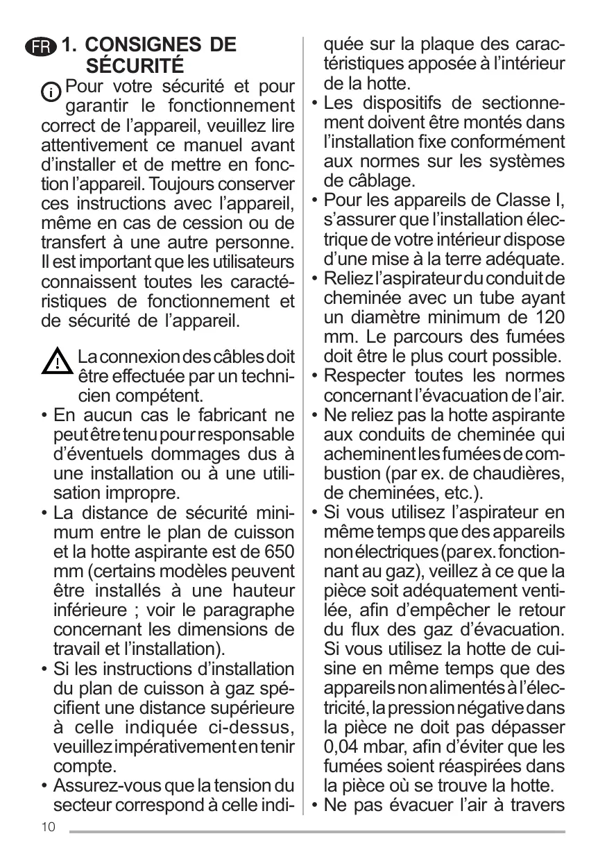 quée sur la plaque des caractéristiques apposée à l’intérieur de la hotte. Les dispositifs de sectionnement doivent être montés dans l’installation fixe conformément aux normes sur les systèmes de câblage. Pour les appareils de Classe I, s’assurer que l’installation électrique de votre intérieur dispose d’une mise à la terre adéquate. Reliez l’aspirateur du conduit de cheminée avec un tube ayant un diamètre minimum de 120 mm. Le parcours des fumées doit être le plus court possible. Respecter toutes les normes concernant l’évacuation de l’air. Ne reliez pas la hotte aspirante aux conduits de cheminée qui acheminent les fumées de combustion (par ex. de chaudières, de cheminées, etc.). Si vous utilisez l’aspirateur en même temps que des appareils non électriques (par ex. fonctionnant au gaz), veillez à ce que la pièce soit adéquatement ventilée, afin d’empêcher le retour du flux des gaz d’évacuation. Si vous utilisez la hotte de cuisine en même temps que des appareils non alimentés à l’électricité, la pression négative dans la pièce ne doit pas dépasser 0,04 mbar, afin d’éviter que les fumées soient réaspirées dans la pièce où se trouve la hotte. Ne pas évacuer l’air à travers