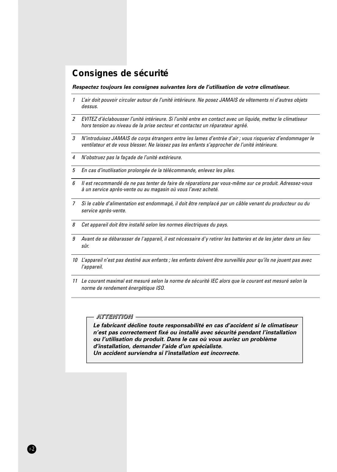 Avant de se débarasser de l'appareil, il est nécessaire d'y retirer les batteries et de les jeter dans un lieu sûr. 10 L’appareil n’est pas destiné aux enfants ; les enfants doivent être surveillés pour qu’ils ne jouent pas avec l’appareil. 11 Le courant maximal est mesuré selon la norme de sécurité IEC alors que le courant est mesuré selon la norme de rendement énergétique ISO. AT T E N T I O N Le fabricant décline toute responsabilité en cas d’accident si le climatiseur n’est pas correctement fixé ou installé avec sécurité pendant l’installation ou l’utilisation du produit. Dans le cas où vous auriez un problème d’installation, demander l’aide d’un spécialiste. Un accident surviendra si l’installation est incorrecte. F-2 Sommaire