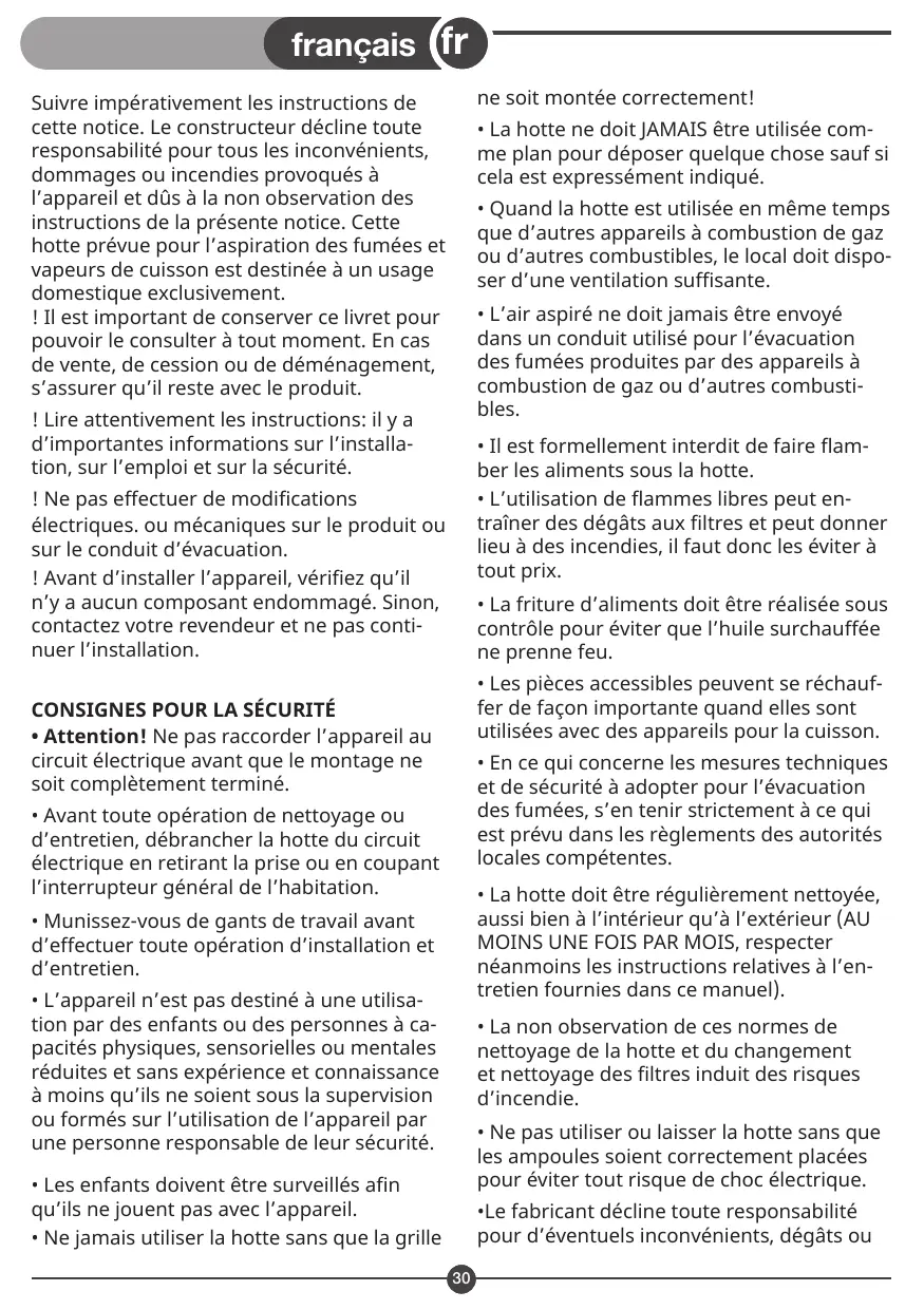 Suivre impérativement les instructions de cette notice. Le constructeur décline toute responsabilité pour tous les inconvénients, dommages ou incendies provoqués à l’appareil et dûs à la non observation des instructions de la présente notice. Cette hotte prévue pour l’aspiration des fumées et vapeurs de cuisson est destinée à un usage domestique exclusivement.