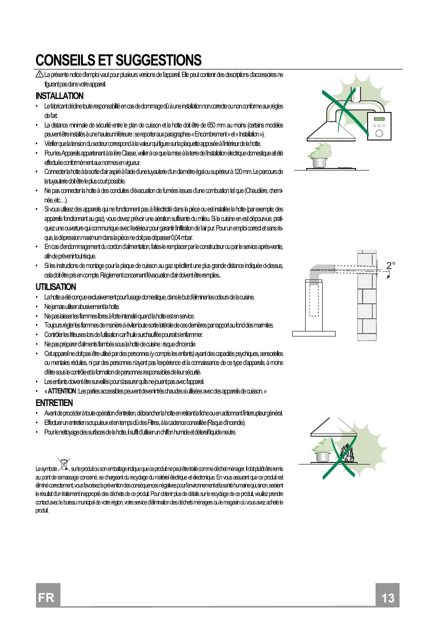 Nejamais utiliser abusivementla hotte. Nepas laisserlesflammeslibres àforteintensitéquand lahotteestenservice. Toujoursrégler lesflammes de manièreà évitertoutesortielatéraledecesdernières par rapport aufonddesmarmites. Contrôler lesfriteuses lorsdel’utilisationcar l’huilesurchaufféepourraits’enflammer. Nepas préparer d’alimentsflambéssouslahotte decuisine:risque d’incendie Cet appareil ne doit pas être utilisé par des personnes (y compris les enfants) ayant des capacités psychiques, sensorieles ou mentales réduites, ni par des personnes n’ayant pas l’expérience et la connaissance de ce type d’appareils, à moins d'être souslecontrôleet laformationdepersonnes responsables de leursécurité. • Les enfants doivent êtresurveiléspours'assurer qu'ils ne jouentpasavec l'appareil. • «ATTENTION:Lesparties accessibles peuvent devenirtrèschaudessi utiliséesavec des appareils decuisson.»