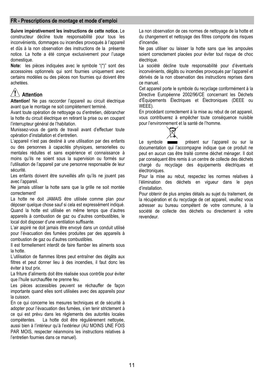 FR - Prescriptions de montage et mode d’emploi Suivre impérativement les instructions de cette notice. Le constructeur décline toute responsabilité pour tous les inconvénients, dommages ou incendies provoqués à l’appareil et dûs à la non observation des instructions de la présente notice. La hotte a été conçue exclusivement pour l’usage domestique. Note: les pièces indiquées avec le symbole “(*)” sont des accessoires optionnels qui sont fournies uniquement avec certains modèles ou des pièces non fournies qui doivent être achetées. La non observation de ces normes de nettoyage de la hotte et du changement et nettoyage des filtres comporte des risques d’incendie. Ne pas utiliser ou laisser la hotte sans que les ampoules soient correctement placées pour éviter tout risque de choc électrique. La société décline toute responsabilité pour d’éventuels inconvénients, dégâts ou incendies provoqués par l’appareil et dérivés de la non observation des instructions reprises dans ce manuel. Cet appareil porte le symbole du recyclage conformément à la Directive Européenne 2002/96/CE concernant les Déchets d’Équipements Électriques et Électroniques (DEEE ou WEEE). En procédant correctement à la mise au rebut de cet appareil, vous contribuerez à empêcher toute conséquence nuisible pour l’environnement et la santé de l’homme. Attention Attention! Ne pas raccorder l’appareil au circuit électrique avant que le montage ne soit complètement terminé. Avant toute opération de nettoyage ou d’entretien, débrancher la hotte du circuit électrique en retirant la prise ou en coupant l’interrupteur général de l’habitation. Munissez-vous de gants de travail avant d’effectuer toute opération d’installation et d’entretien. L’appareil n’est pas destiné à une utilisation par des enfants ou des personnes à capacités physiques, sensorielles ou mentales réduites et sans expérience et connaissance à moins qu’ils ne soient sous la supervision ou formés sur l’utilisation de l’appareil par une personne responsable de leur sécurité. Les enfants doivent être surveillés afin qu’ils ne jouent pas avec l’appareil. Ne jamais utiliser la hotte sans que la grille ne soit montée correctement! La hotte ne doit JAMAIS être utilisée comme plan pour déposer quelque chose sauf si cela est expressément indiqué. Quand la hotte est utilisée en même temps que d’autres appareils à combustion de gaz ou d’autres combustibles, le local doit disposer d’une ventilation suffisante. L’air aspiré ne doit jamais être envoyé dans un conduit utilisé pour l’évacuation des fumées produites par des appareils à combustion de gaz ou d’autres combustibles. Il est formellement interdit de faire flamber les aliments sous la hotte. L’utilisation de flammes libres peut entraîner des dégâts aux filtres et peut donner lieu à des incendies, il faut donc les éviter à tout prix. La friture d’aliments doit être réalisée sous contrôle pour éviter que l’huile surchauffée ne prenne feu. Les pièces accessibles peuvent se réchauffer de façon importante quand elles sont utilisées avec des appareils pour la cuisson. En ce qui concerne les mesures techniques et de sécurité à adopter pour l’évacuation des fumées, s’en tenir strictement à ce qui est prévu dans les règlements des autorités locales compétentes. La hotte doit être régulièrement nettoyée, aussi bien à l’intérieur qu’à l’extérieur (AU MOINS UNE FOIS PAR MOIS, respecter néanmoins les instructions relatives à l’entretien fournies dans ce manuel). présent sur l’appareil ou sur la Le symbole documentation qui l’accompagne indique que ce produit ne peut en aucun cas être traité comme déchet ménager. Il doit par conséquent être remis à un centre de collecte des déchets chargé du recyclage des équipements électriques et électroniques. Pour la mise au rebut, respectez les normes relatives à l’élimination des déchets en vigueur dans le pays d’installation. Pour obtenir de plus amples détails au sujet du traitement, de la récupération et du recyclage de cet appareil, veuillez vous adresser au bureau compétent de votre commune, à la société de collecte des déchets ou directement à votre revendeur.