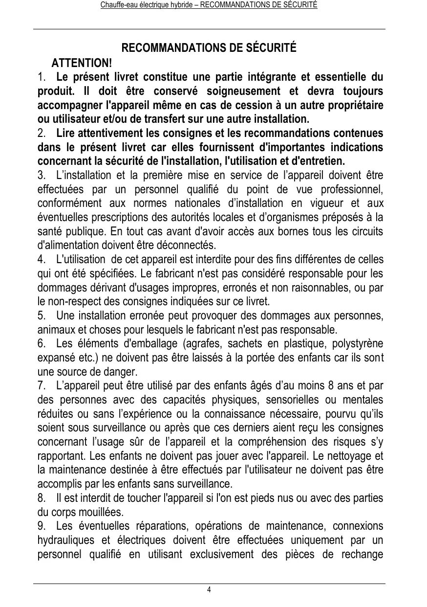 Notre engagement permanent à réaliser des produits innovants et efficaces ainsi que votre comportement responsable dans l’emploi rationnel d’énergie pourront donc contribuer activement à la sauvegarde de l’environnement et des ressources naturelles. Conserver avec soin ce livret d’instructions, qui est conçu pour vous informer, vous avertir et conseiller, sur le correct emploi et entretien de l’appareil. Notre SAV local reste à votre complète disposition pour tous vos besoins. INTRODUCTION Ce livret est destiné à l’installateur et à l’utilisateur final, qui devront respectivement installer et utiliser le chauffe-eau électrique hybride. La non-observation des indications de cette notice entraine la perte du bénéfice de la garantie. Cette notice constitue une partie intégrante et essentielle de l’appareil. Ce livret est à conserver avec soin par l’utilisateur et doit toujours accompagner l’appareil, même en cas de cession à un autre propriétaire ou utilisateur et/ou de transfert dans une autre installation. Afin d’utiliser correctement et en toute sécurité l’appareil, l’installateur et l’utilisateur, pour leurs compétences respectives, sont priés de lire les instructions et les avertissements contenus dans ce livret d’instruction, car il vous fournira d’importantes informations de sécurité et d’installation, ainsi que d’utilisation et d’entretien. Ce livret est divisé en quatre parties: -