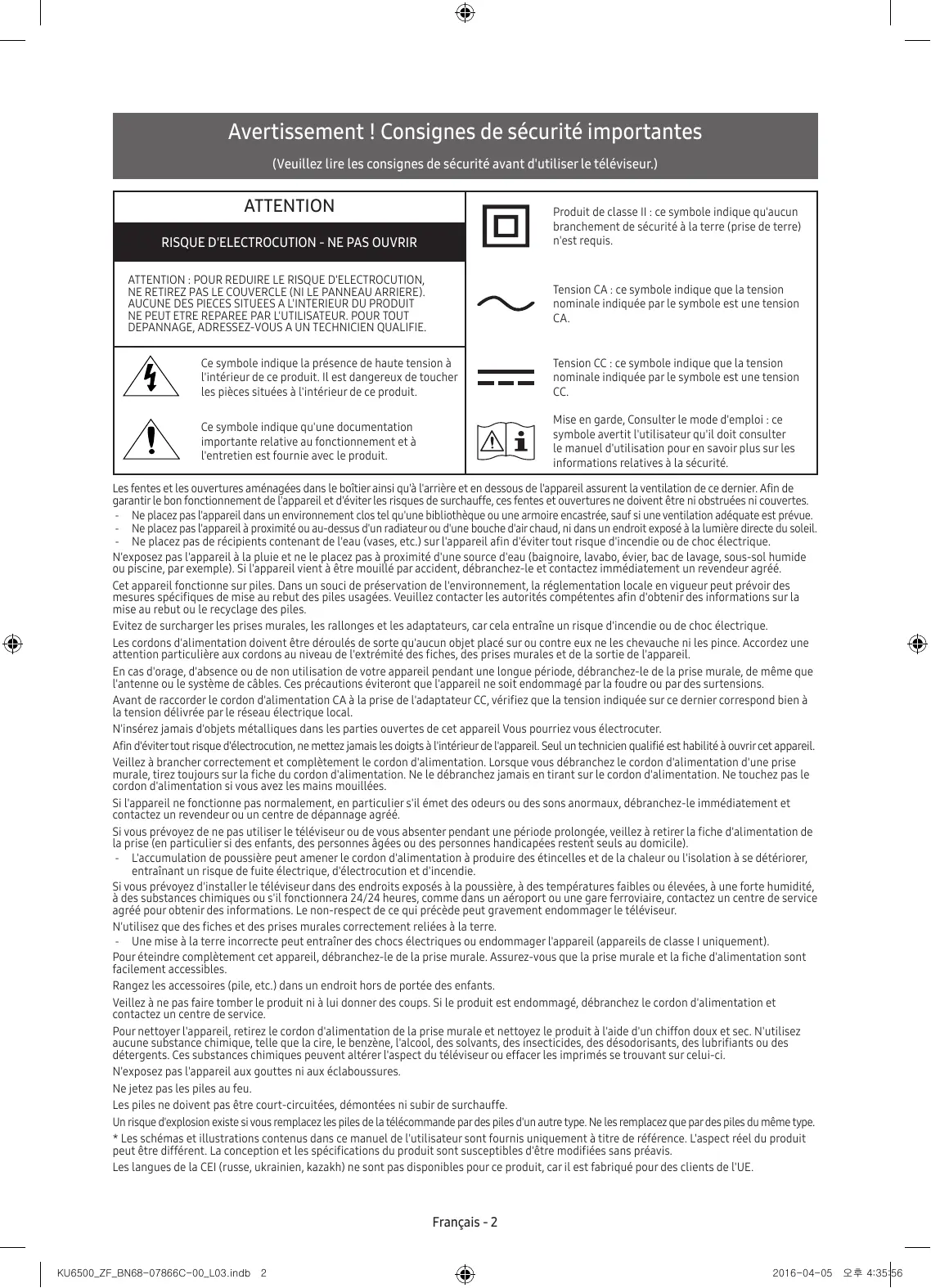 ATTENTION : POUR REDUIRE LE RISQUE D'ELECTROCUTION, NE RETIREZ PAS LE COUVERCLE (NI LE PANNEAU ARRIERE). AUCUNE DES PIECES SITUEES A L'INTERIEUR DU PRODUIT NE PEUT ETRE REPAREE PAR L'UTILISATEUR. POUR TOUT DEPANNAGE, ADRESSEZ-VOUS A UN TECHNICIEN QUALIFIE. Tension CA : ce symbole indique que la tension nominale indiquée par le symbole est une tension CA. Ce symbole indique la présence de haute tension à l'intérieur de ce produit. Il est dangereux de toucher les pièces situées à l'intérieur de ce produit. Tension CC : ce symbole indique que la tension nominale indiquée par le symbole est une tension CC. Ce symbole indique qu'une documentation importante relative au fonctionnement et à l'entretien est fournie avec le produit. Mise en garde, Consulter le mode d'emploi : ce symbole avertit l'utilisateur qu'il doit consulter le manuel d'utilisation pour en savoir plus sur les informations relatives à la sécurité. Les fentes et les ouvertures aménagées dans le boîtier ainsi qu'à l'arrière et en dessous de l'appareil assurent la ventilation de ce dernier. Afin de garantir le bon fonctionnement de l'appareil et d'éviter les risques de surchauffe, ces fentes et ouvertures ne doivent être ni obstruées ni couvertes. -- Ne placez pas l'appareil dans un environnement clos tel qu'une bibliothèque ou une armoire encastrée, sauf si une ventilation adéquate est prévue. -- Ne placez pas l'appareil à proximité ou au-dessus d'un radiateur ou d'une bouche d'air chaud, ni dans un endroit exposé à la lumière directe du soleil. -- Ne placez pas de récipients contenant de l'eau (vases, etc.) sur l'appareil afin d'éviter tout risque d'incendie ou de choc électrique. N'exposez pas l'appareil à la pluie et ne le placez pas à proximité d'une source d'eau (baignoire, lavabo, évier, bac de lavage, sous-sol humide ou piscine, par exemple). Si l'appareil vient à être mouillé par accident, débranchez-le et contactez immédiatement un revendeur agréé. Cet appareil fonctionne sur piles. Dans un souci de préservation de l'environnement, la réglementation locale en vigueur peut prévoir des mesures spécifiques de mise au rebut des piles usagées. Veuillez contacter les autorités compétentes afin d'obtenir des informations sur la mise au rebut ou le recyclage des piles. Evitez de surcharger les prises murales, les rallonges et les adaptateurs, car cela entraîne un risque d'incendie ou de choc électrique. Les cordons d'alimentation doivent être déroulés de sorte qu'aucun objet placé sur ou contre eux ne les chevauche ni les pince. Accordez une attention particulière aux cordons au niveau de l'extrémité des fiches, des prises murales et de la sortie de l'appareil. En cas d'orage, d'absence ou de non utilisation de votre appareil pendant une longue période, débranchez-le de la prise murale, de même que l'antenne ou le système de câbles. Ces précautions éviteront que l'appareil ne soit endommagé par la foudre ou par des surtensions. Avant de raccorder le cordon d'alimentation CA à la prise de l'adaptateur CC, vérifiez que la tension indiquée sur ce dernier correspond bien à la tension délivrée par le réseau électrique local. N'insérez jamais d'objets métalliques dans les parties ouvertes de cet appareil Vous pourriez vous électrocuter. Afin d'éviter tout risque d'électrocution, ne mettez jamais les doigts à l'intérieur de l'appareil. Seul un technicien qualifié est habilité à ouvrir cet appareil. Veillez à brancher correctement et complètement le cordon d'alimentation. Lorsque vous débranchez le cordon d'alimentation d'une prise murale, tirez toujours sur la fiche du cordon d'alimentation. Ne le débranchez jamais en tirant sur le cordon d'alimentation. Ne touchez pas le cordon d'alimentation si vous avez les mains mouillées. Si l'appareil ne fonctionne pas normalement, en particulier s'il émet des odeurs ou des sons anormaux, débranchez-le immédiatement et contactez un revendeur ou un centre de dépannage agréé. Si vous prévoyez de ne pas utiliser le téléviseur ou de vous absenter pendant une période prolongée, veillez à retirer la fiche d'alimentation de la prise (en particulier si des enfants, des personnes âgées ou des personnes handicapées restent seuls au domicile). -- L'accumulation de poussière peut amener le cordon d'alimentation à produire des étincelles et de la chaleur ou l'isolation à se détériorer, entraînant un risque de fuite électrique, d'électrocution et d'incendie. Si vous prévoyez d'installer le téléviseur dans des endroits exposés à la poussière, à des températures faibles ou élevées, à une forte humidité, à des substances chimiques ou s'il fonctionnera 24/24 heures, comme dans un aéroport ou une gare ferroviaire, contactez un centre de service agréé pour obtenir des informations. Le non-respect de ce qui précède peut gravement endommager le téléviseur. N'utilisez que des fiches et des prises murales correctement reliées à la terre. -- Une mise à la terre incorrecte peut entraîner des chocs électriques ou endommager l'appareil (appareils de classe I uniquement). Pour éteindre complètement cet appareil, débranchez-le de la prise murale. Assurez-vous que la prise murale et la fiche d'alimentation sont facilement accessibles. Rangez les accessoires (pile, etc.) dans un endroit hors de portée des enfants. Veillez à ne pas faire tomber le produit ni à lui donner des coups. Si le produit est endommagé, débranchez le cordon d'alimentation et contactez un centre de service. Pour nettoyer l'appareil, retirez le cordon d'alimentation de la prise murale et nettoyez le produit à l'aide d'un chiffon doux et sec. N'utilisez aucune substance chimique, telle que la cire, le benzène, l'alcool, des solvants, des insecticides, des désodorisants, des lubrifiants ou des détergents. Ces substances chimiques peuvent altérer l'aspect du téléviseur ou effacer les imprimés se trouvant s