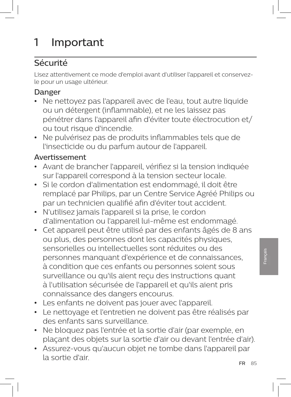 Sécurité Danger • Ne nettoyez pas l'appareil avec de l'eau, tout autre liquide ou un détergent (inflammable), et ne les laissez pas pénétrer dans l'appareil afin d'éviter toute électrocution et/ ou tout risque d'incendie. • Ne pulvérisez pas de produits inflammables tels que de l'insecticide ou du parfum autour de l'appareil. Avertissement • Avant de brancher l'appareil, vérifiez si la tension indiquée sur l'appareil correspond à la tension secteur locale. • Si le cordon d'alimentation est endommagé, il doit être remplacé par Philips, par un Centre Service Agréé Philips ou par un technicien qualifié afin d'éviter tout accident. • N'utilisez jamais l'appareil si la prise, le cordon d'alimentation ou l'appareil lui-même est endommagé. • Cet appareil peut être utilisé par des enfants âgés de 8 ans ou plus, des personnes dont les capacités physiques, sensorielles ou intellectuelles sont réduites ou des personnes manquant d'expérience et de connaissances, à condition que ces enfants ou personnes soient sous surveillance ou qu'ils aient reçu des instructions quant à l'utilisation sécurisée de l'appareil et qu'ils aient pris connaissance des dangers encourus. • Les enfants ne doivent pas jouer avec l'appareil. • Le nettoyage et l'entretien ne doivent pas être réalisés par des enfants sans surveillance. • Ne bloquez pas l'entrée et la sortie d'air (par exemple, en plaçant des objets sur la sortie d'air ou devant l'entrée d'air). • Assurez-vous qu'aucun objet ne tombe dans l'appareil par la sortie d'air. FR