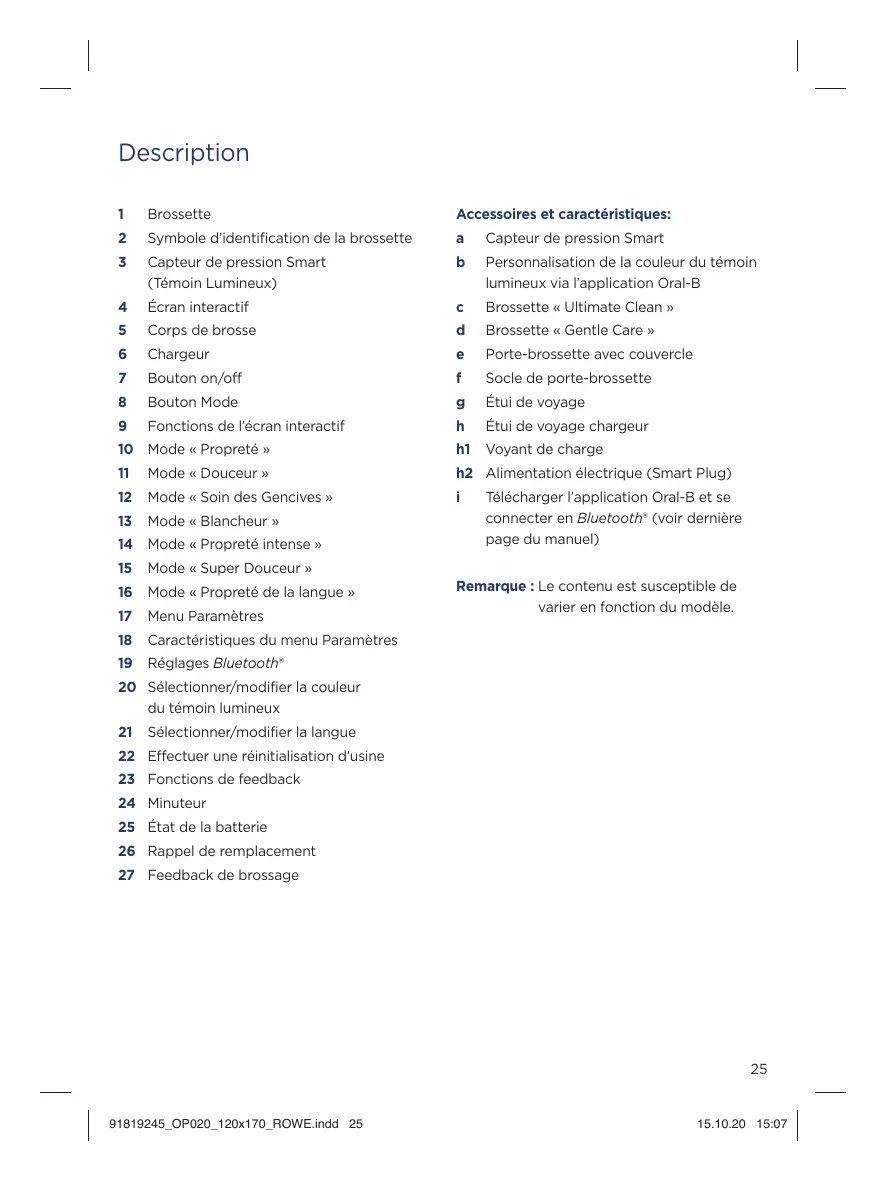 23 Fonctions de feedback 24 Minuteur 25 État de la batterie 26 Rappel de remplacement 27 Feedback de brossage