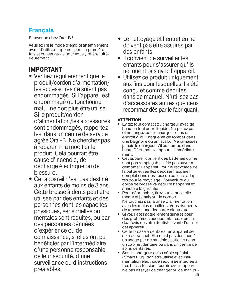 • Il convient de surveiller les enfants pour s’assurer qu’ils ne jouent pas avec l’appareil. • Utilisez ce produit uniquement aux fins pour lesquelles il a été conçu et comme décrites dans ce manuel. N’utilisez pas d’accessoires autres que ceux recommandés par le fabriquant. ATTENTION • Evitez tout contact du chargeur avec de l’eau ou tout autre liquide. Ne posez pas et ne rangez pas le chargeur dans un endroit d’où il risquerait de tomber dans une baignoire ou un lavabo. Ne ramassez jamais le chargeur s’il est tombé dans l’eau. Débranchez l’appareil immédiatement. • Cet appareil contient des batteries qui ne sont pas remplaçables. Ne pas ouvrir ni démonter l’appareil. Pour le recyclage de la batterie, veuillez déposer l’appareil complet dans des lieux de collecte adaptés pour le recyclage. L’ouverture du corps de brosse va détruire l’appareil et annulera la garantie. • Pour débrancher, tirez sur la prise ellemême et jamais sur le cordon. Ne touchez pas la prise d’alimentation avec les mains mouillées. Vous risqueriez de recevoir une décharge électrique. • Si vous êtes actuellement suivi(e) pour des problèmes buccodentaires, demandez l’avis de votre dentiste avant d’utiliser cet appareil. • Cette brosse à dents est un appareil de soin personnel. Elle n’est pas destinée à un usage par de multiples patients dans un cabinet dentaire ou dans un centre de soins dentaires. • Seul le chargeur et/ou câble spécial (Smart Plug) doit être utilisé avec l’alimentation électrique sécurisée intégrée à très basse tension, fournie avec l’appareil. Ne pas essayer de changer ou de manipu25