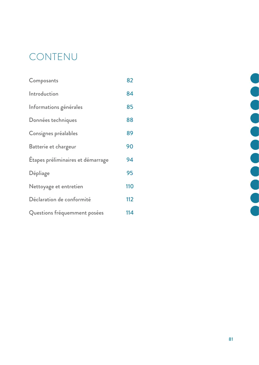 | Entretien et nettoyage | Nettoyage avec un chiffon humide, vérification régulière des freins |