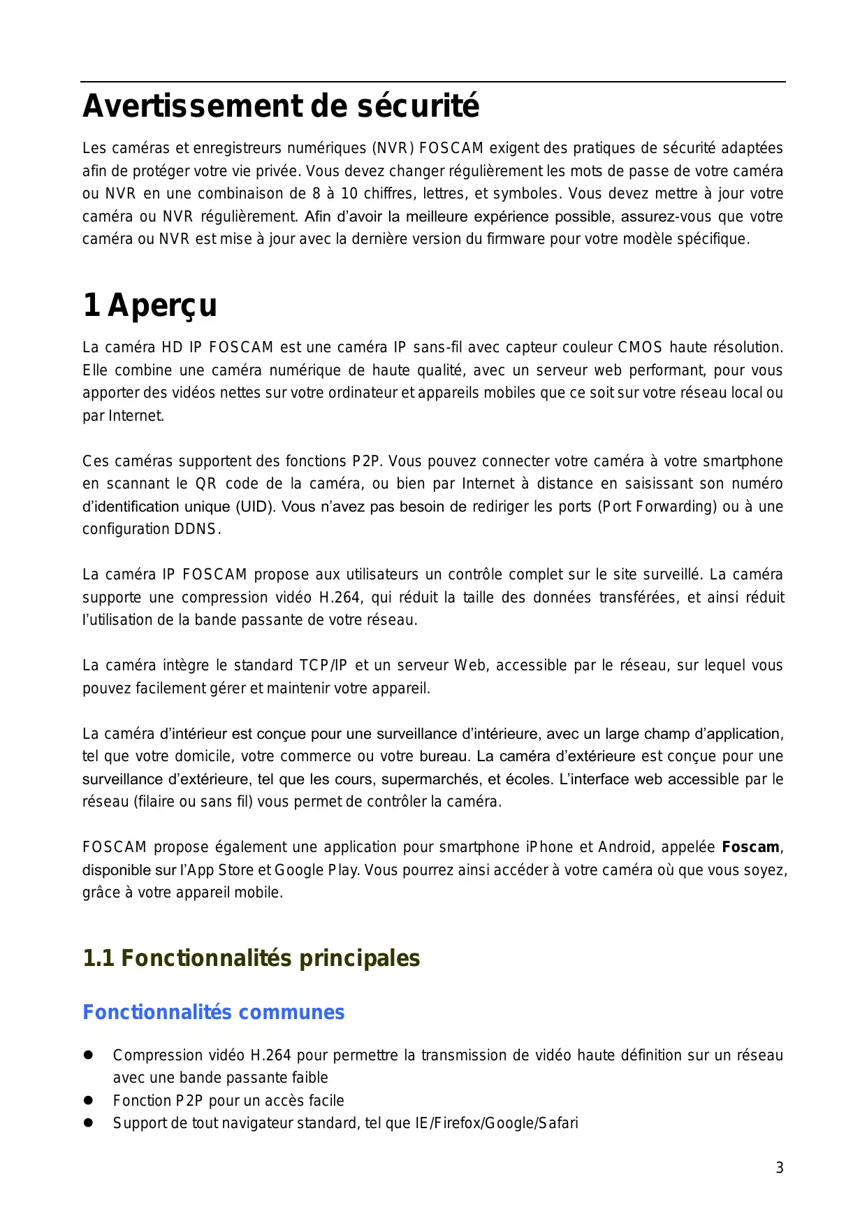 Avertissement de sécurité Les caméras et enregistreurs numériques (NVR) FOSCAM exigent des pratiques de sécurité adaptées afin de protéger votre vie privée. Vous devez changer régulièrement les mots de passe de votre caméra ou NVR en une combinaison de 8 à 10 chiffres, lettres, et symboles. Vous devez mettre à jour votre caméra ou NVR régulièrement. Afin d’avoir la meilleure expérience possible, assurez-vous que votre caméra ou NVR est mise à jour avec la dernière version du firmware pour votre modèle spécifique. 1 Aperçu La caméra HD IP FOSCAM est une caméra IP sans-fil avec capteur couleur CMOS haute résolution. Elle combine une caméra numérique de haute qualité, avec un serveur web performant, pour vous apporter des vidéos nettes sur votre ordinateur et appareils mobiles que ce soit sur votre réseau local ou par Internet. Ces caméras supportent des fonctions P2P. Vous pouvez connecter votre caméra à votre smartphone en scannant le QR code de la caméra, ou bien par Internet à distance en saisissant son numéro d’identification unique (UID). Vous n’avez pas besoin de rediriger les ports (Port Forwarding) ou à une configuration DDNS. La caméra IP FOSCAM propose aux utilisateurs un contrôle complet sur le site surveillé. La caméra supporte une compression vidéo H.264, qui réduit la taille des données transférées, et ainsi réduit l’utilisation de la bande passante de votre réseau. La caméra intègre le standard TCP/IP et un serveur Web, accessible par le réseau, sur lequel vous pouvez facilement gérer et maintenir votre appareil. La caméra d’intérieur est conçue pour une surveillance d’intérieure, avec un large champ d’application, tel que votre domicile, votre commerce ou votre bureau. La caméra d’extérieure est conçue pour une surveillance d’extérieure, tel que les cours, supermarchés, et écoles. L’interface web accessible par le réseau (filaire ou sans fil) vous permet de contrôler la caméra. FOSCAM propose également une application pour smartphone iPhone et Android, appelée Foscam, disponible sur l’App Store et Google Play. Vous pourrez ainsi accéder à votre caméra où que vous soyez, grâce à votre appareil mobile.