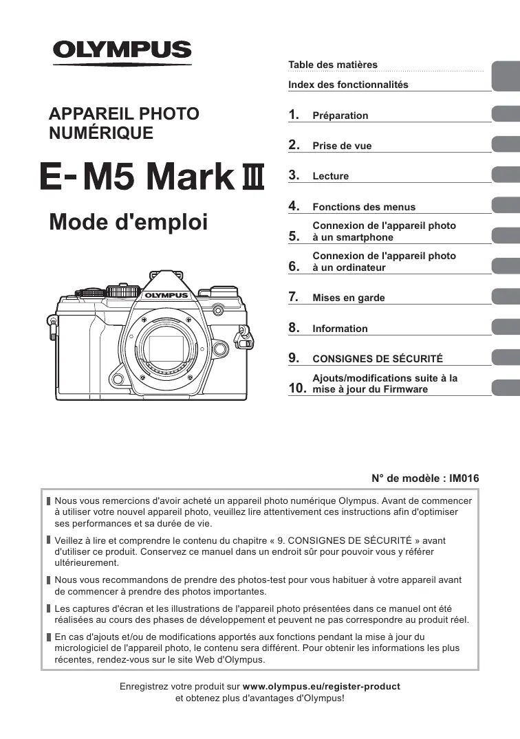 Ajouts/modifications suite à la mise à jour du Firmware N° de modèle : IM016 Nous vous remercions d'avoir acheté un appareil photo numérique Olympus. Avant de commencer à utiliser votre nouvel appareil photo, veuillez lire attentivement ces instructions afin d'optimiser ses performances et sa durée de vie. Veillez à lire et comprendre le contenu du chapitre « 9. CONSIGNES DE SÉCURITÉ » avant d'utiliser ce produit. Conservez ce manuel dans un endroit sûr pour pouvoir vous y référer ultérieurement. Nous vous recommandons de prendre des photos-test pour vous habituer à votre appareil avant de commencer à prendre des photos importantes. Les captures d'écran et les illustrations de l'appareil photo présentées dans ce manuel ont été réalisées au cours des phases de développement et peuvent ne pas correspondre au produit réel. En cas d'ajouts et/ou de modifications apportés aux fonctions pendant la mise à jour du micrologiciel de l'appareil photo, le contenu sera différent. Pour obtenir les informations les plus récentes, rendez-vous sur le site Web d'Olympus. Enregistrez votre produit sur www.olympus.eu/register-product et obtenez plus d'avantages d'Olympus! Manuels du produit Manuels du produit En plus du « Mode d'emploi », nous fournissons également un « Guide des fonctions de l'appareil photo ». Consultez ces manuels lorsque vous utilisez le produit. 7DEOHGHVPDWLqUHV ,QGH[GHVIRQFWLRQQDOLWpV $33$5(,/3+272 180e5,48( 0RGHG HPSORL