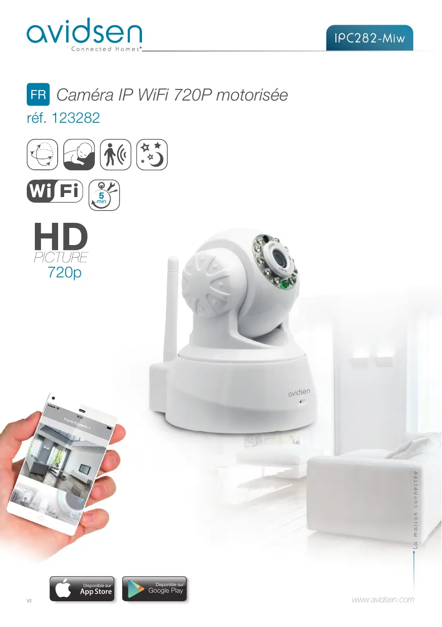 4 - RETOUR PRODUIT - SAV Malgré le soin apporté à la conception et fabrication de votre produit, si ce dernier nécessite un retour en service après-vente dans nos locaux, il est possible de consulter l’avancement des interventions sur notre site internet à l’adresse suivante : http://sav.avidsen.com Avidsen s’engage à disposer d’un stock de pièces détachées sur ce produit pendant la période de garantie contractuelle. 5 - DECLARATION DE CONFORMITE Aux directives LVD et EMC Avidsen déclare que l’équipement : Caméra IP WiFi 720P motorisée 123282 Est conforme à la directive 1999/5/CE et que sa conformité a été évaluée selon les normes applicables en vigueur: • EN 60950-1 :2006+A11 :2009+A1 :2010+A12 :2011+A2 :2013 • EN 62311 :2008 • EN 301 489-1 V1.9.2 • EN 301 489-17 V2.2.1 • EN 300 328 V1.8.1 Date : 01/06/2015 Alexandre Chaverot, président