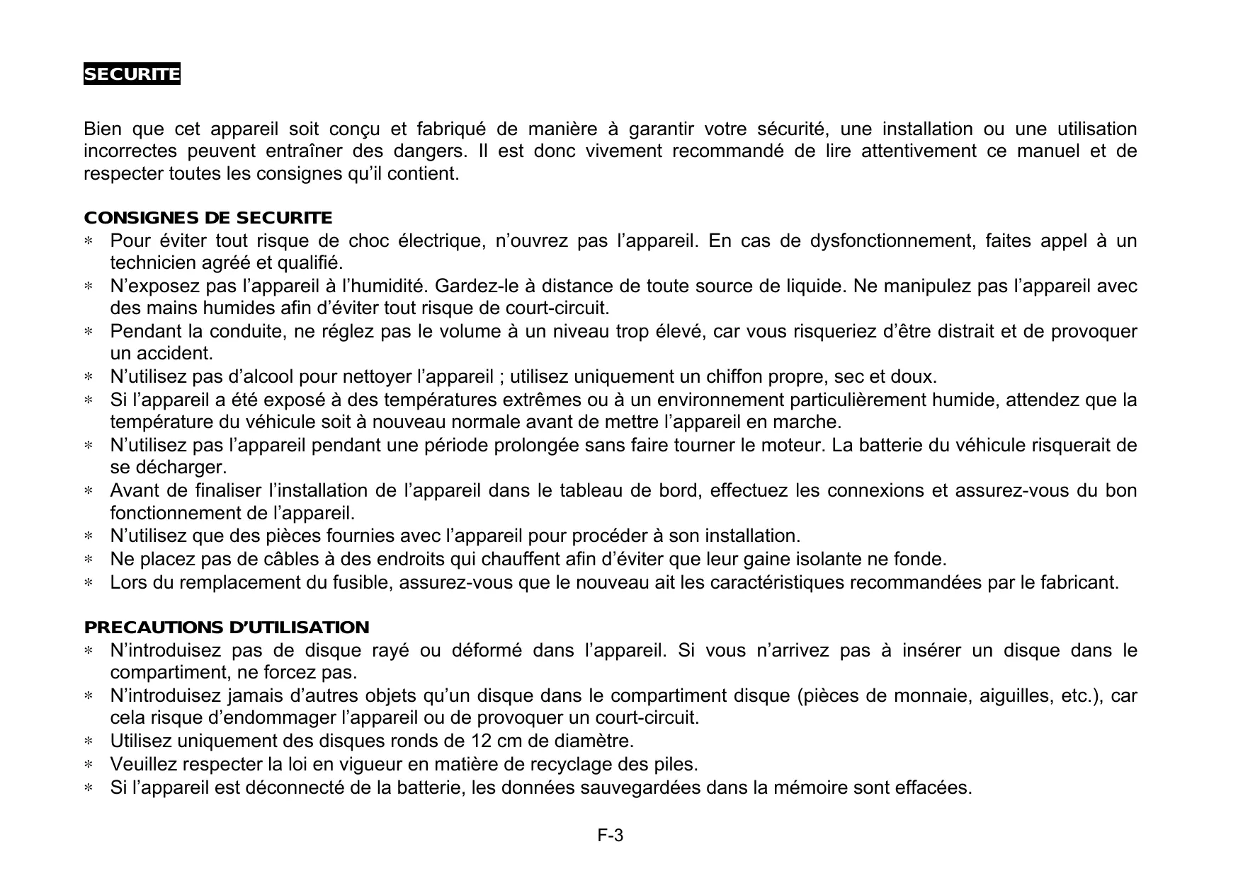 PRECAUTIONS D'UTILISATION