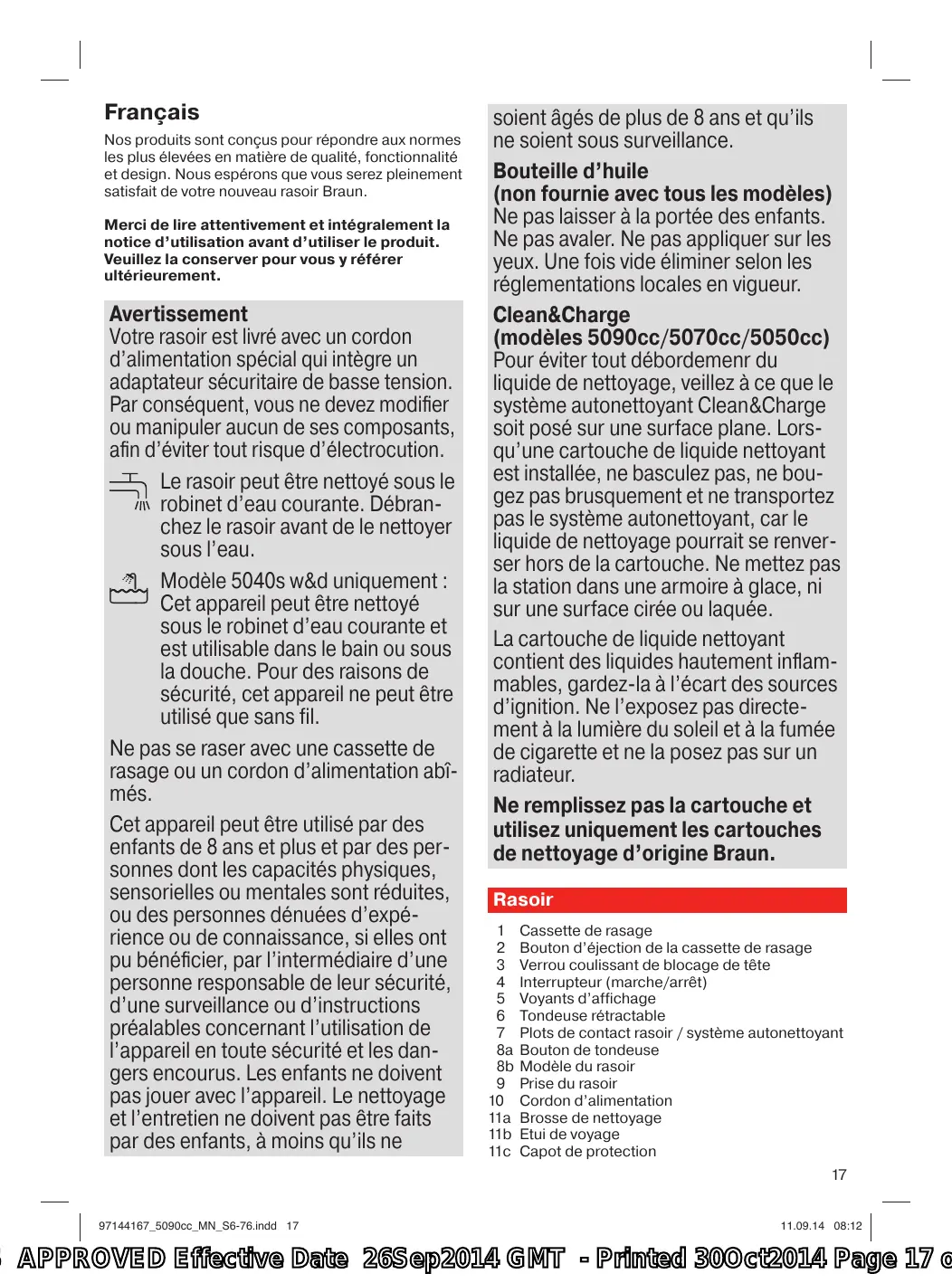 Bouteille d’huile (non fournie avec tous les modèles) Ne pas laisser à la portée des enfants. Ne pas avaler. Ne pas appliquer sur les yeux. Une fois vide éliminer selon les réglementations locales en vigueur. Clean&Charge (modèles 5090cc/5070cc/5050cc) Pour éviter tout débordemenr du liquide de nettoyage, veillez à ce que le système autonettoyant Clean&Charge soit posé sur une surface plane. Lorsqu’une cartouche de liquide nettoyant est installée, ne basculez pas, ne bougez pas brusquement et ne transportez pas le système autonettoyant, car le liquide de nettoyage pourrait se renverser hors de la cartouche. Ne mettez pas la station dans une armoire à glace, ni sur une surface cirée ou laquée. La cartouche de liquide nettoyant contient des liquides hautement inflammables, gardez-la à l’écart des sources d’ignition. Ne l’exposez pas directement à la lumière du soleil et à la fumée de cigarette et ne la posez pas sur un radiateur. Ne remplissez pas la cartouche et utilisez uniquement les cartouches de nettoyage d’origine Braun. Rasoir 1 2 3 4 5 6 7 8a 8b 9 10 11a 11b 11c