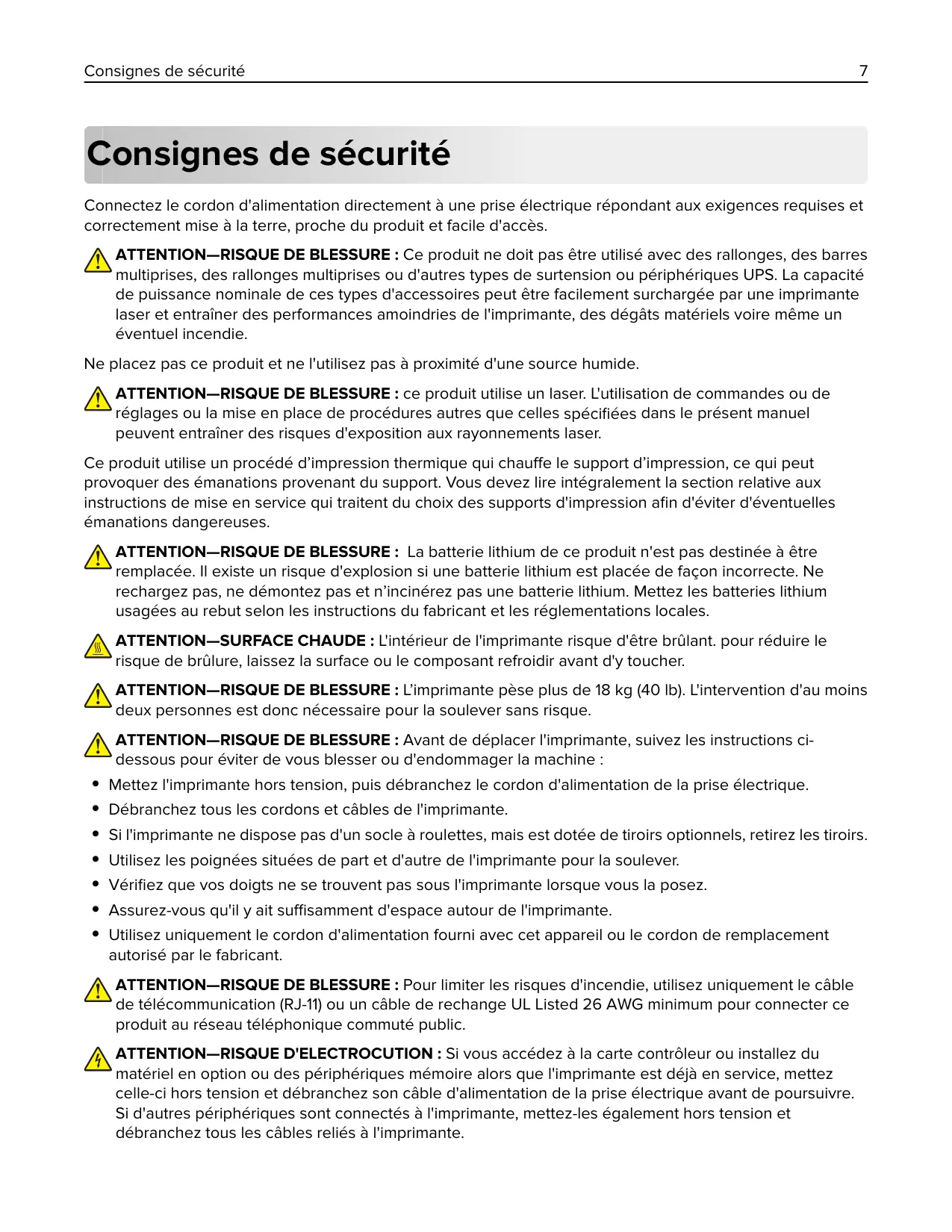 Consignes de sécurité Connectez le cordon d'alimentation directement à une prise électrique répondant aux exigences requises et correctement mise à la terre, proche du produit et facile d'accès. ATTENTION—RISQUE DE BLESSURE : Ce produit ne doit pas être utilisé avec des rallonges, des barres multiprises, des rallonges multiprises ou d'autres types de surtension ou périphériques UPS. La capacité de puissance nominale de ces types d'accessoires peut être facilement surchargée par une imprimante laser et entraîner des performances amoindries de l'imprimante, des dégâts matériels voire même un éventuel incendie. Ne placez pas ce produit et ne l'utilisez pas à proximité d'une source humide. ATTENTION—RISQUE DE BLESSURE : ce produit utilise un laser. L'utilisation de commandes ou de réglages ou la mise en place de procédures autres que celles spécifiées dans le présent manuel peuvent entraîner des risques d'exposition aux rayonnements laser. Ce produit utilise un procédé d’impression thermique qui chauffe le support d’impression, ce qui peut provoquer des émanations provenant du support. Vous devez lire intégralement la section relative aux instructions de mise en service qui traitent du choix des supports d'impression afin d'éviter d'éventuelles émanations dangereuses. ATTENTION—RISQUE DE BLESSURE : La batterie lithium de ce produit n'est pas destinée à être remplacée. Il existe un risque d'explosion si une batterie lithium est placée de façon incorrecte. Ne rechargez pas, ne démontez pas et n’incinérez pas une batterie lithium. Mettez les batteries lithium usagées au rebut selon les instructions du fabricant et les réglementations locales. ATTENTION—SURFACE CHAUDE : L'intérieur de l'imprimante risque d'être brûlant. pour réduire le risque de brûlure, laissez la surface ou le composant refroidir avant d'y toucher. ATTENTION—RISQUE DE BLESSURE : L’imprimante pèse plus de 18 kg (40 lb). L'intervention d'au moins deux personnes est donc nécessaire pour la soulever sans risque. ATTENTION—RISQUE DE BLESSURE : Avant de déplacer l'imprimante, suivez les instructions cidessous pour éviter de vous blesser ou d'endommager la machine :