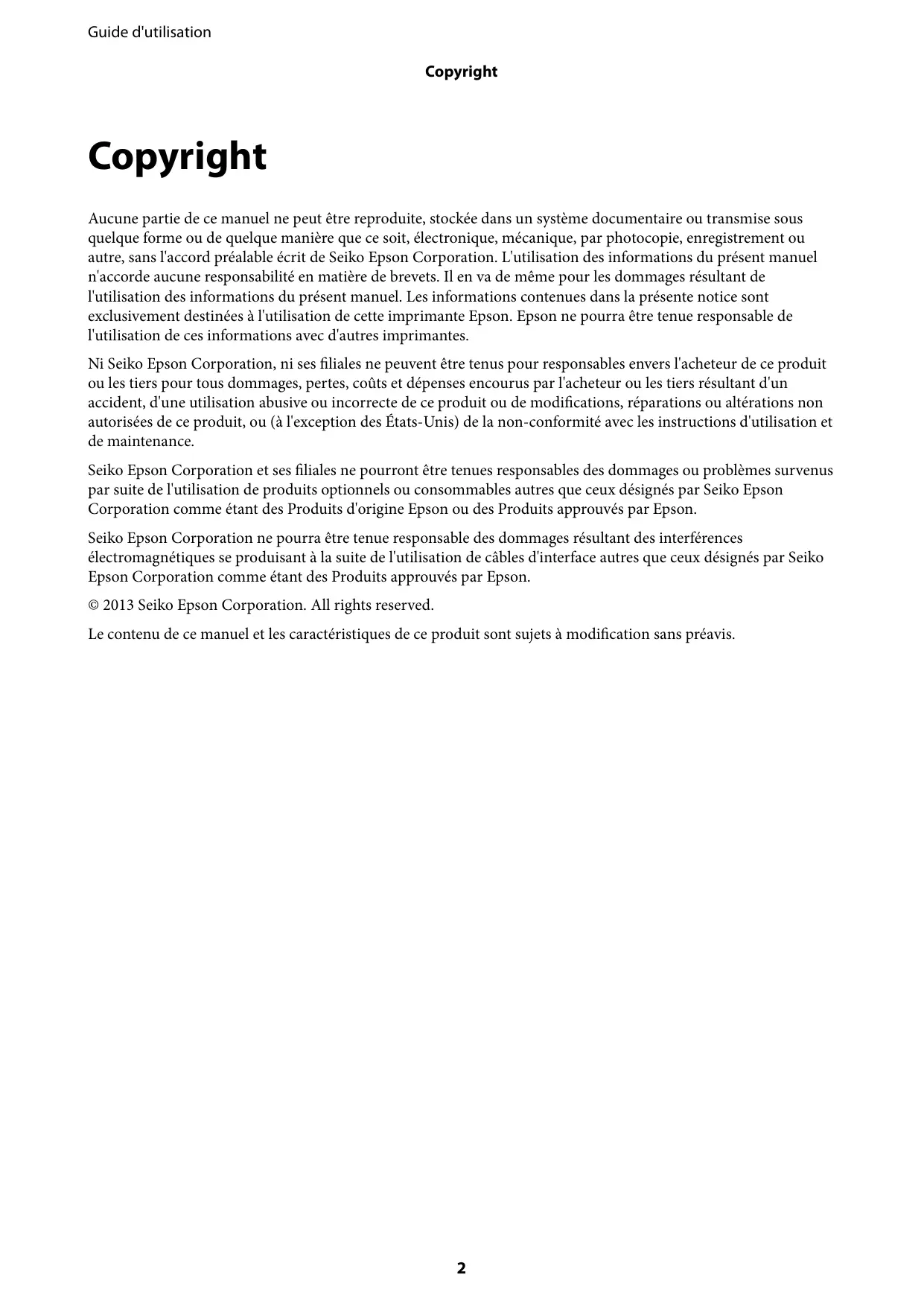 Guide d'utilisation Copyright Copyright Aucune partie de ce manuel ne peut être reproduite, stockée dans un système documentaire ou transmise sous quelque forme ou de quelque manière que ce soit, électronique, mécanique, par photocopie, enregistrement ou autre, sans l'accord préalable écrit de Seiko Epson Corporation. L'utilisation des informations du présent manuel n'accorde aucune responsabilité en matière de brevets. Il en va de même pour les dommages résultant de l'utilisation des informations du présent manuel. Les informations contenues dans la présente notice sont exclusivement destinées à l'utilisation de cette imprimante Epson. Epson ne pourra être tenue responsable de l'utilisation de ces informations avec d'autres imprimantes. Ni Seiko Epson Corporation, ni ses filiales ne peuvent être tenus pour responsables envers l'acheteur de ce produit ou les tiers pour tous dommages, pertes, coûts et dépenses encourus par l'acheteur ou les tiers résultant d'un accident, d'une utilisation abusive ou incorrecte de ce produit ou de modifications, réparations ou altérations non autorisées de ce produit, ou (à l'exception des États-Unis) de la non-conformité avec les instructions d'utilisation et de maintenance. Seiko Epson Corporation et ses filiales ne pourront être tenues responsables des dommages ou problèmes survenus par suite de l'utilisation de produits optionnels ou consommables autres que ceux désignés par Seiko Epson Corporation comme étant des Produits d'origine Epson ou des Produits approuvés par Epson. Seiko Epson Corporation ne pourra être tenue responsable des dommages résultant des interférences électromagnétiques se produisant à la suite de l'utilisation de câbles d'interface autres que ceux désignés par Seiko Epson Corporation comme étant des Produits approuvés par Epson. © 2013 Seiko Epson Corporation. All rights reserved. Le contenu de ce manuel et les caractéristiques de ce produit sont sujets à modification sans préavis.