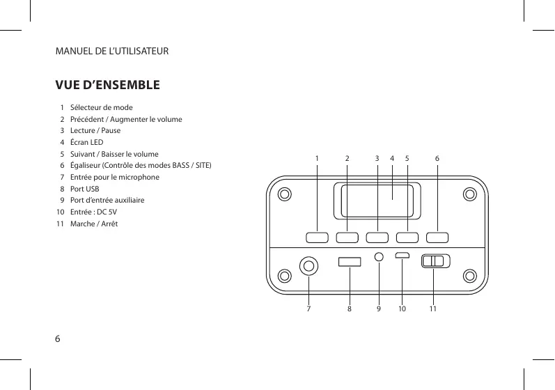 Sélecteur de mode Précédent / Augmenter le volume Lecture / Pause Écran LED Suivant / Baisser le volume Égaliseur (Contrôle des modes BASS / SITE) Entrée pour le microphone Port USB Port d’entrée auxiliaire Entrée : DC 5V Marche / Arrêt