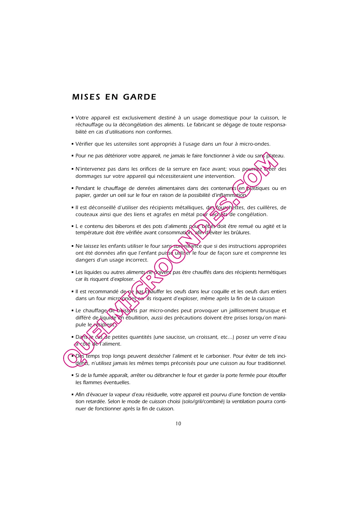 • Votre appareil est exclusivement destiné à un usage domestique pour la cuisson, le réchauffage ou la décongélation des aliments. Le fabricant se dégage de toute responsabilité en cas d’utilisations non conformes. • Vérifier que les ustensiles sont appropriés à l’usage dans un four à micro-ondes. • Pour ne pas détériorer votre appareil, ne jamais le faire fonctionner à vide ou sans plateau. • N’intervenez pas dans les orifices de la serrure en face avant; vous pourriez créer des dommages sur votre appareil qui nécessiteraient une intervention. • Pendant le chauffage de denrées alimentaires dans des contenants en plastiques ou en papier, garder un oeil sur le four en raison de la possibilité d’inflammation. • Il est déconseillé d’utiliser des récipients métalliques, des fourchettes, des cuillères, de couteaux ainsi que des liens et agrafes en métal pour sachets de congélation. • L e contenu des biberons et des pots d’aliments pour bébés doit être remué ou agité et la température doit être vérifiée avant consommation, afin d’éviter les brûlures. • Ne laissez les enfants utiliser le four sans surveillance que si des instructions appropriées ont été données afin que l’enfant puisse utiliser le four de façon sure et comprenne les dangers d’un usage incorrect. • Les liquides ou autres aliments ne doivent pas être chauffés dans des récipients hermétiques car ils risquent d’exploser. • Il est recommandé de ne pas chauffer les oeufs dans leur coquille et les oeufs durs entiers dans un four micro-ondes car ils risquent d’exploser, même après la fin de la cuisson • Le chauffage de boissons par micro-ondes peut provoquer un jaillissement brusque et différé de liquide en ébullition, aussi des précautions doivent être prises lorsqu’on manipule le récipient. • Dans le cas de petites quantités (une saucisse, un croissant, etc...) posez un verre d’eau à côté de l’aliment. • Des temps trop longs peuvent dessécher l’aliment et le carboniser. Pour éviter de tels incidents, n’utilisez jamais les mêmes temps préconisés pour une cuisson au four traditionnel. • Si de la fumée apparaît, arrêter ou débrancher le four et garder la porte fermée pour étouffer les flammes éventuelles. • Afin d’évacuer la vapeur d’eau résiduelle, votre appareil est pourvu d’une fonction de ventilation retardée. Selon le mode de cuisson choisi (solo/gril/combiné) la ventilation pourra continuer de fonctionner après la fin de cuisson. 10