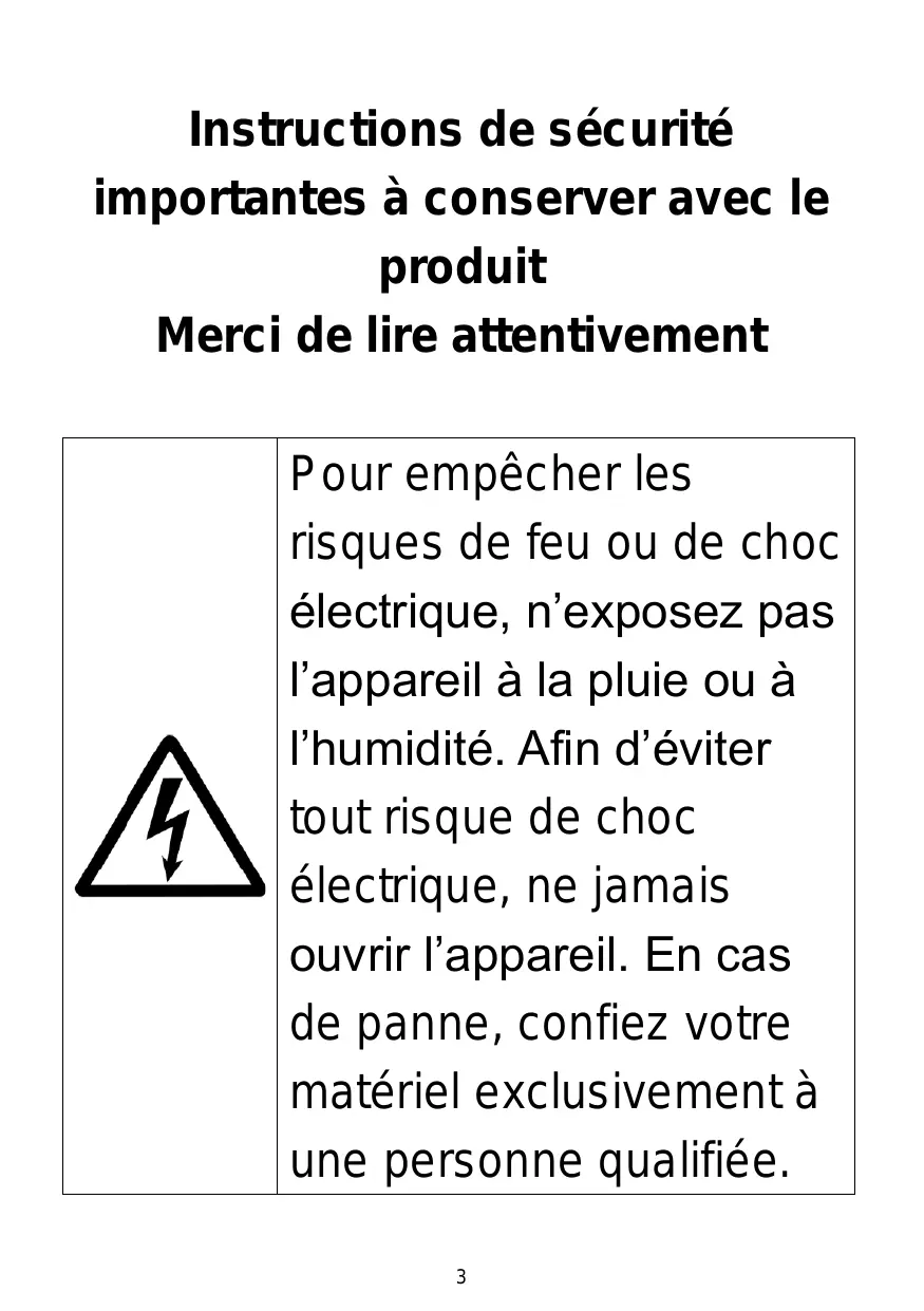 Instructions de sécurité importantes à conserver avec le produit Merci de lire attentivement Pour empêcher les risques de feu ou de choc électrique, n’exposez pas l’appareil à la pluie ou à l’humidité. Afin d’éviter tout risque de choc électrique, ne jamais ouvrir l’appareil. En cas de panne, confiez votre matériel exclusivement à une personne qualifiée. 3
