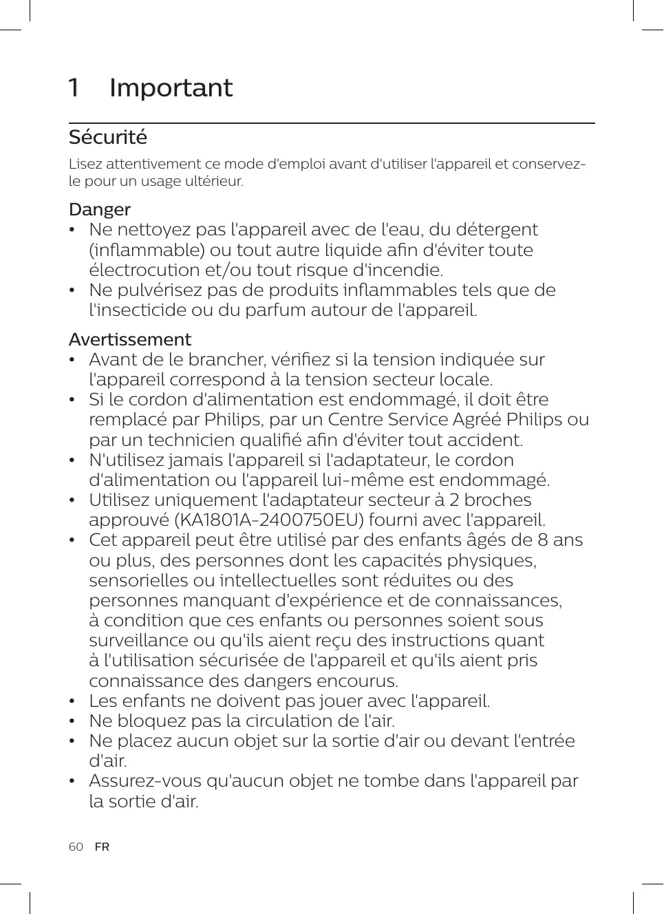• Ne nettoyez pas l'appareil avec de l'eau, du détergent (inflammable) ou tout autre liquide afin d'éviter toute électrocution et/ou tout risque d'incendie. • Ne pulvérisez pas de produits inflammables tels que de l'insecticide ou du parfum autour de l'appareil. Avertissement • Avant de le brancher, vérifiez si la tension indiquée sur l'appareil correspond à la tension secteur locale. • Si le cordon d'alimentation est endommagé, il doit être remplacé par Philips, par un Centre Service Agréé Philips ou par un technicien qualifié afin d'éviter tout accident. • N'utilisez jamais l'appareil si l'adaptateur, le cordon d'alimentation ou l'appareil lui-même est endommagé. • Utilisez uniquement l'adaptateur secteur à 2 broches approuvé (KA1801A-2400750EU) fourni avec l'appareil. • Cet appareil peut être utilisé par des enfants âgés de 8 ans ou plus, des personnes dont les capacités physiques, sensorielles ou intellectuelles sont réduites ou des personnes manquant d'expérience et de connaissances, à condition que ces enfants ou personnes soient sous surveillance ou qu'ils aient reçu des instructions quant à l'utilisation sécurisée de l'appareil et qu'ils aient pris connaissance des dangers encourus. • Les enfants ne doivent pas jouer avec l'appareil. • Ne bloquez pas la circulation de l'air. • Ne placez aucun objet sur la sortie d'air ou devant l'entrée d'air. • Assurez-vous qu'aucun objet ne tombe dans l'appareil par la sortie d'air.
