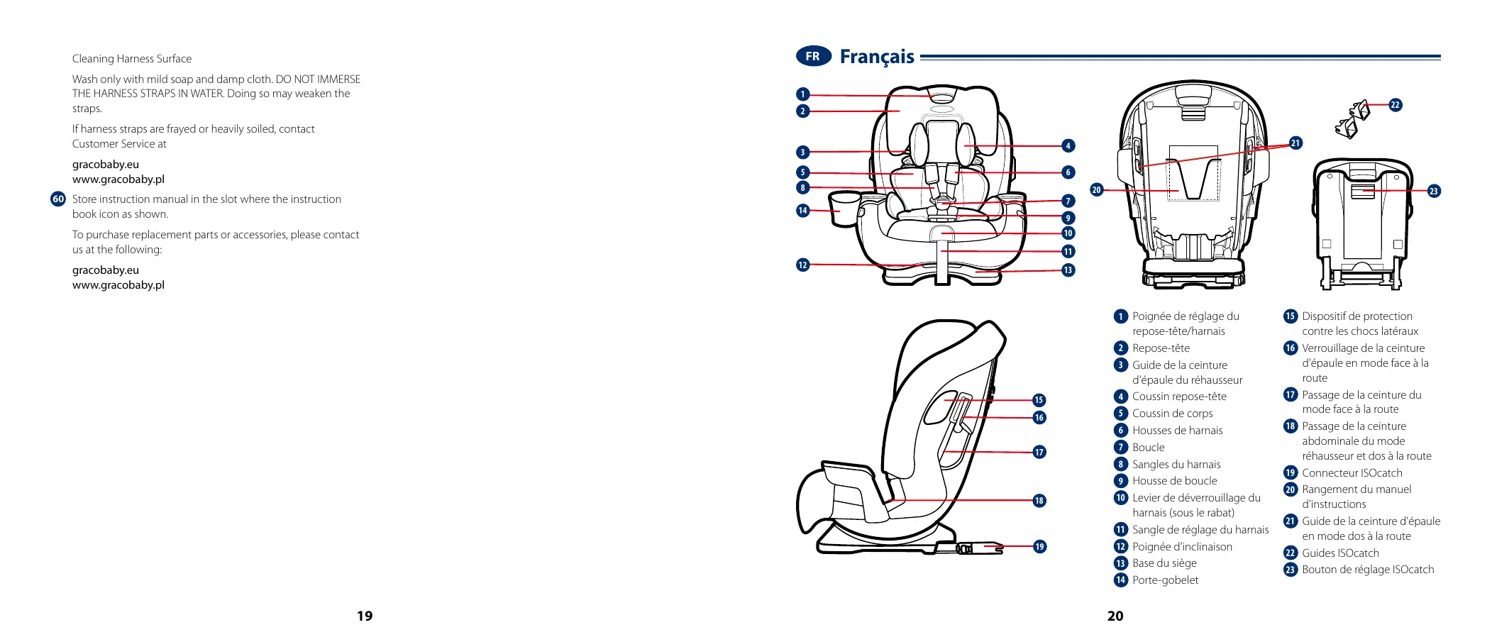 Répétez les étapes si nécessaire jusqu'à ce que la fermeture émette un déclic. Réinsérez la boucle dans la fente où elle avait été enlevée. Tirez sur la boucle d'entrejambe pour vous assurer qu'elle est attachée. Nettoyer la surface du harnais Lavez uniquement avec du savon doux et un chiffon humide. N'IMMERGEZ PAS LES SANGLES DU HARNAIS DANS L'EAU. Cela pourrait fragiliser les sangles. Si les sangles du harnais sont effilochées ou très sales, contactez le service client à l'adresse gracobaby.eu www.gracobaby.pl 60 Rangez le manuel d'instructions dans la fente avec l'icône du livret d'instructions comme indiqué. Pour acheter des pièces ou des accessoires, veuillez nous contacter aux coordonnées suivantes : gracobaby.eu www.gracobaby.pl