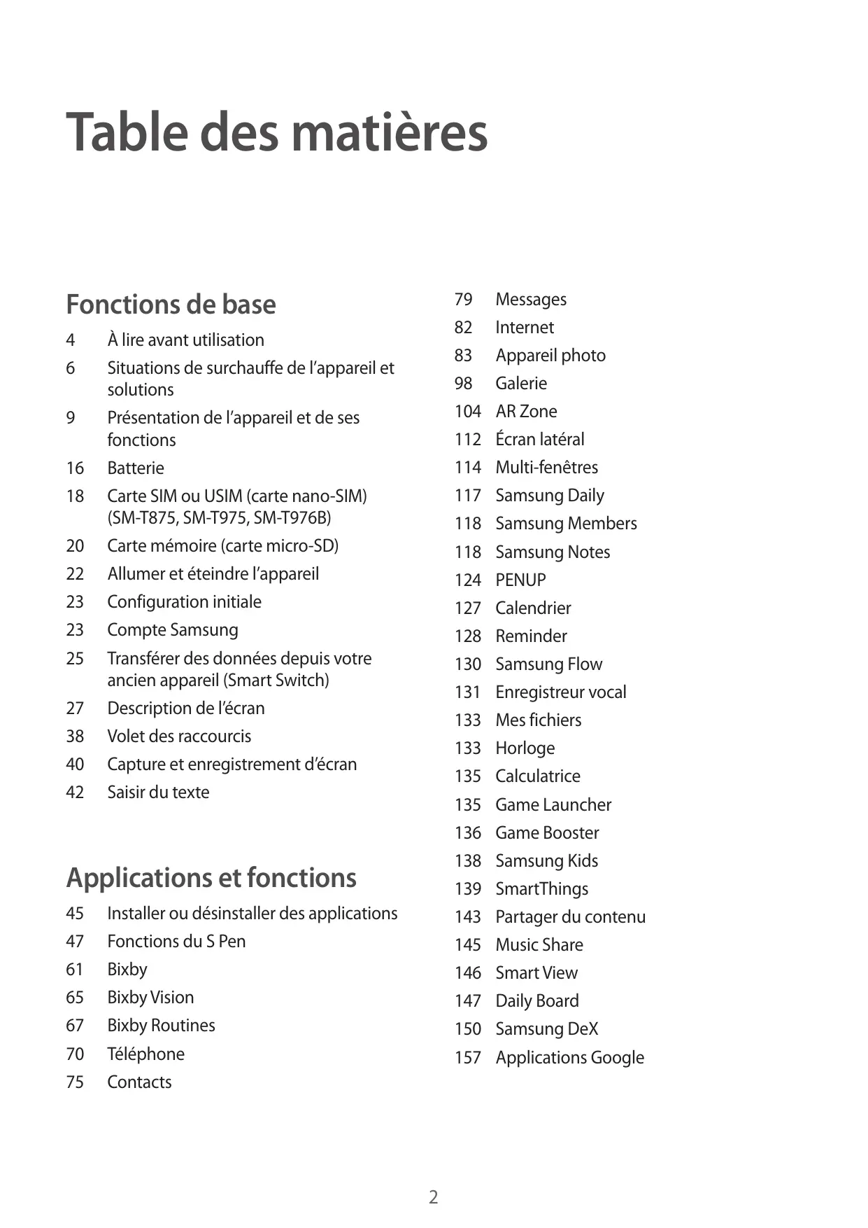 À lire avant utilisation Situations de surchauffe de l’appareil et solutions Présentation de l’appareil et de ses fonctions Batterie Carte SIM ou USIM (carte nano-SIM) (SM-T875, SM-T975, SM-T976B) Carte mémoire (carte micro-SD) Allumer et éteindre l’appareil Configuration initiale Compte Samsung Transférer des données depuis votre ancien appareil (Smart Switch) Description de l’écran Volet des raccourcis Capture et enregistrement d’écran Saisir du texte Applications et fonctions
