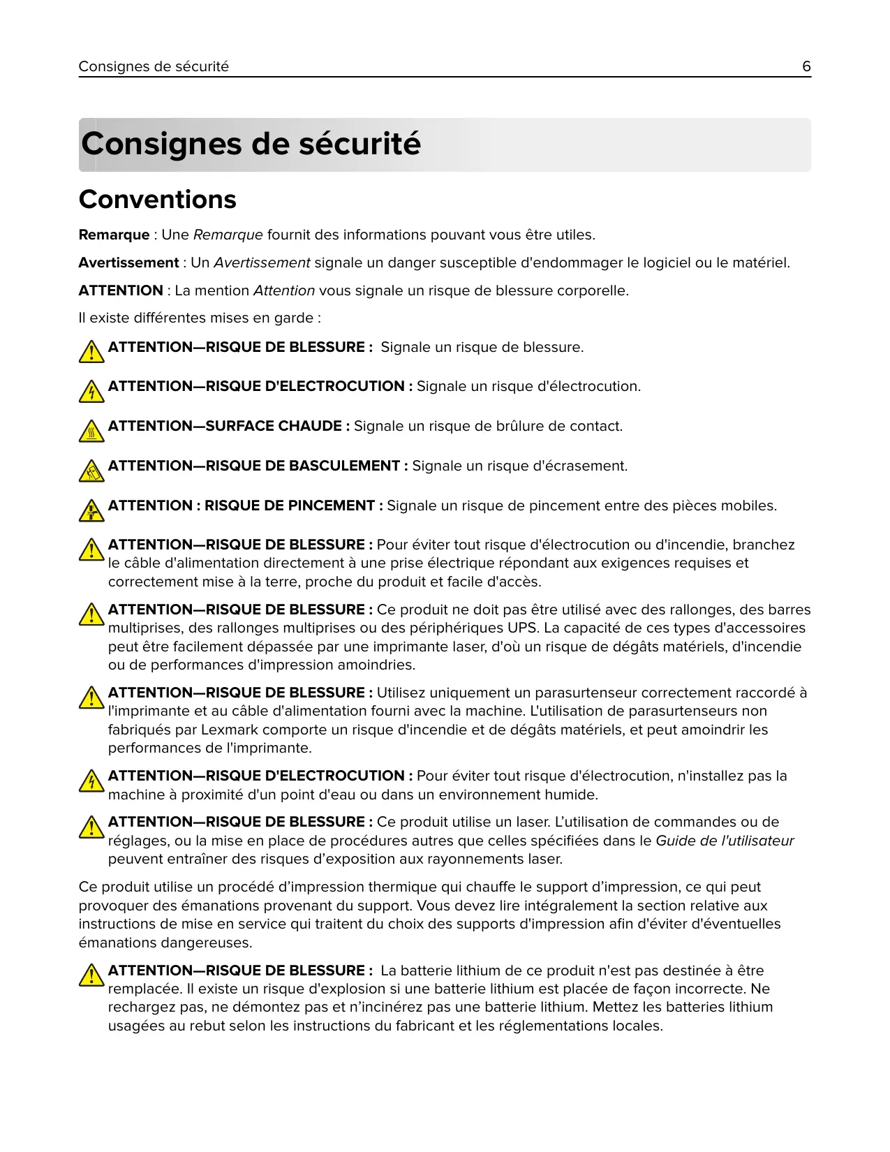 Consignes de sécurité Conventions Remarque : Une Remarque fournit des informations pouvant vous être utiles. Avertissement : Un Avertissement signale un danger susceptible d'endommager le logiciel ou le matériel. ATTENTION : La mention Attention vous signale un risque de blessure corporelle. Il existe différentes mises en garde : ATTENTION—RISQUE DE BLESSURE : Signale un risque de blessure. ATTENTION—RISQUE D'ELECTROCUTION : Signale un risque d'électrocution. ATTENTION—SURFACE CHAUDE : Signale un risque de brûlure de contact. ATTENTION—RISQUE DE BASCULEMENT : Signale un risque d'écrasement. ATTENTION : RISQUE DE PINCEMENT : Signale un risque de pincement entre des pièces mobiles. ATTENTION—RISQUE DE BLESSURE : Pour éviter tout risque d'électrocution ou d'incendie, branchez le câble d'alimentation directement à une prise électrique répondant aux exigences requises et correctement mise à la terre, proche du produit et facile d'accès. ATTENTION—RISQUE DE BLESSURE : Ce produit ne doit pas être utilisé avec des rallonges, des barres multiprises, des rallonges multiprises ou des périphériques UPS. La capacité de ces types d'accessoires peut être facilement dépassée par une imprimante laser, d'où un risque de dégâts matériels, d'incendie ou de performances d'impression amoindries. ATTENTION—RISQUE DE BLESSURE : Utilisez uniquement un parasurtenseur correctement raccordé à l'imprimante et au câble d'alimentation fourni avec la machine. L'utilisation de parasurtenseurs non fabriqués par Lexmark comporte un risque d'incendie et de dégâts matériels, et peut amoindrir les performances de l'imprimante. ATTENTION—RISQUE D'ELECTROCUTION : Pour éviter tout risque d'électrocution, n'installez pas la machine à proximité d'un point d'eau ou dans un environnement humide. ATTENTION—RISQUE DE BLESSURE : Ce produit utilise un laser. L’utilisation de commandes ou de réglages, ou la mise en place de procédures autres que celles spécifiées dans le Guide de l'utilisateur peuvent entraîner des risques d’exposition aux rayonnements laser. Ce produit utilise un procédé d’impression thermique qui chauffe le support d’impression, ce qui peut provoquer des émanations provenant du support. Vous devez lire intégralement la section relative aux instructions de mise en service qui traitent du choix des supports d'impression afin d'éviter d'éventuelles émanations dangereuses. ATTENTION—RISQUE DE BLESSURE : La batterie lithium de ce produit n'est pas destinée à être remplacée. Il existe un risque d'explosion si une batterie lithium est placée de façon incorrecte. Ne rechargez pas, ne démontez pas et n’incinérez pas une batterie lithium. Mettez les batteries lithium usagées au rebut selon les instructions du fabricant et les réglementations locales.