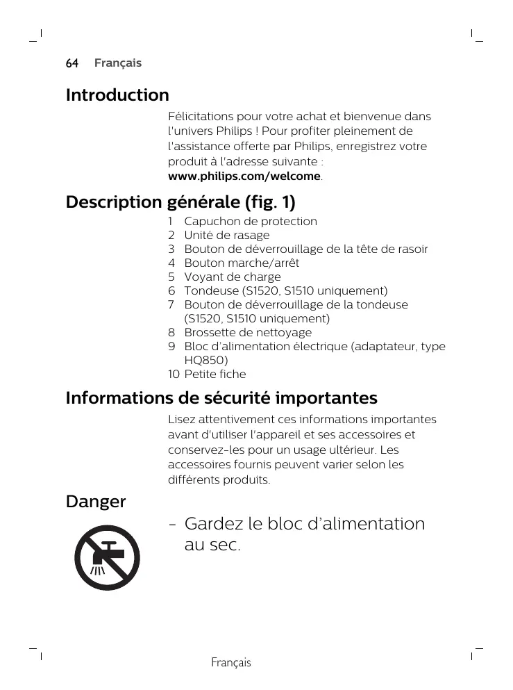 Capuchon de protection Unité de rasage Bouton de déverrouillage de la tête de rasoir Bouton marche/arrêt Voyant de charge Tondeuse (S1520, S1510 uniquement) Bouton de déverrouillage de la tondeuse (S1520, S1510 uniquement) 8 Brossette de nettoyage 9 Bloc d’alimentation électrique (adaptateur, type HQ850) 10 Petite fiche