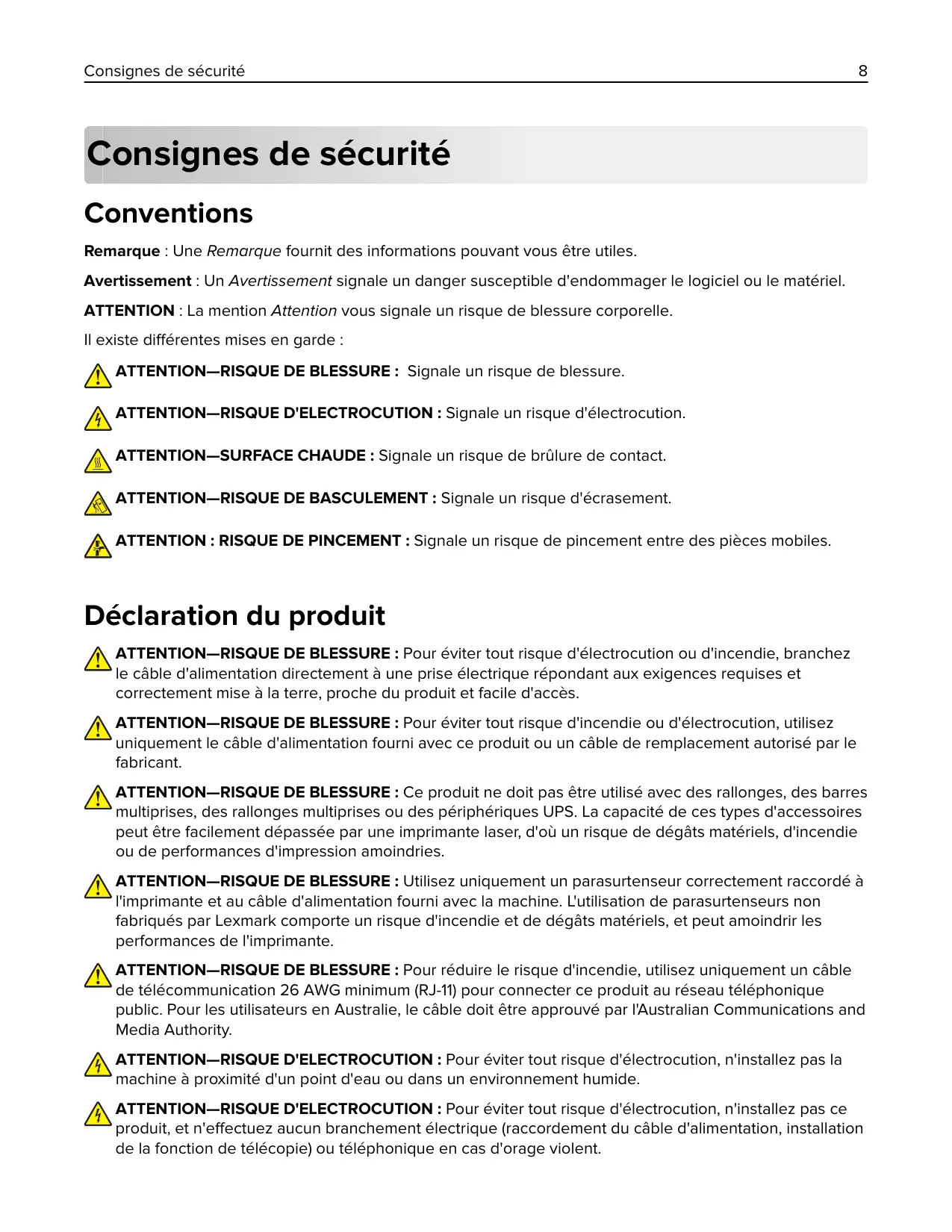 Déclaration du produit ATTENTION—RISQUE DE BLESSURE : Pour éviter tout risque d'électrocution ou d'incendie, branchez le câble d'alimentation directement à une prise électrique répondant aux exigences requises et correctement mise à la terre, proche du produit et facile d'accès. ATTENTION—RISQUE DE BLESSURE : Pour éviter tout risque d'incendie ou d'électrocution, utilisez uniquement le câble d'alimentation fourni avec ce produit ou un câble de remplacement autorisé par le fabricant. ATTENTION—RISQUE DE BLESSURE : Ce produit ne doit pas être utilisé avec des rallonges, des barres multiprises, des rallonges multiprises ou des périphériques UPS. La capacité de ces types d'accessoires peut être facilement dépassée par une imprimante laser, d'où un risque de dégâts matériels, d'incendie ou de performances d'impression amoindries. ATTENTION—RISQUE DE BLESSURE : Utilisez uniquement un parasurtenseur correctement raccordé à l'imprimante et au câble d'alimentation fourni avec la machine. L'utilisation de parasurtenseurs non fabriqués par Lexmark comporte un risque d'incendie et de dégâts matériels, et peut amoindrir les performances de l'imprimante. ATTENTION—RISQUE DE BLESSURE : Pour réduire le risque d'incendie, utilisez uniquement un câble de télécommunication 26 AWG minimum (RJ-11) pour connecter ce produit au réseau téléphonique public. Pour les utilisateurs en Australie, le câble doit être approuvé par l'Australian Communications and Media Authority. ATTENTION—RISQUE D'ELECTROCUTION : Pour éviter tout risque d'électrocution, n'installez pas la machine à proximité d'un point d'eau ou dans un environnement humide. ATTENTION—RISQUE D'ELECTROCUTION : Pour éviter tout risque d'électrocution, n'installez pas ce produit, et n'effectuez aucun branchement électrique (raccordement du câble d'alimentation, installation de la fonction de télécopie) ou téléphonique en cas d'orage violent.