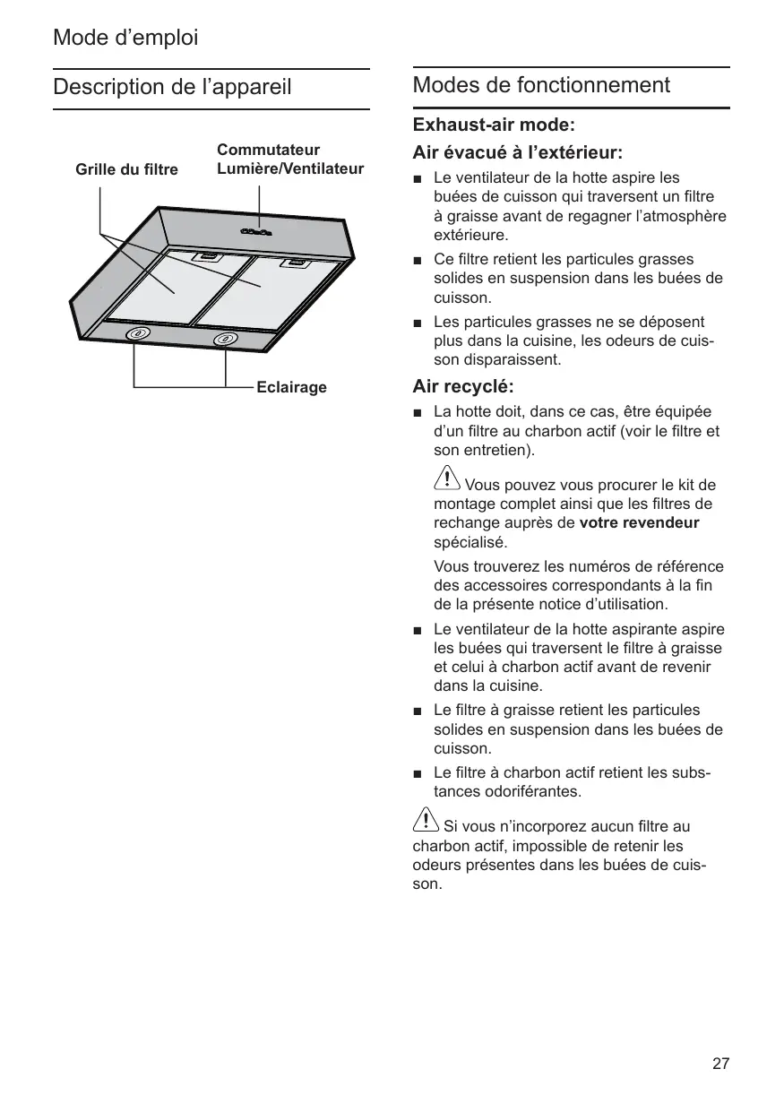 La hotte doit, dans ce cas, etre equipeed'un filtrue au charbon actif (voir le filtrer etson entretien).