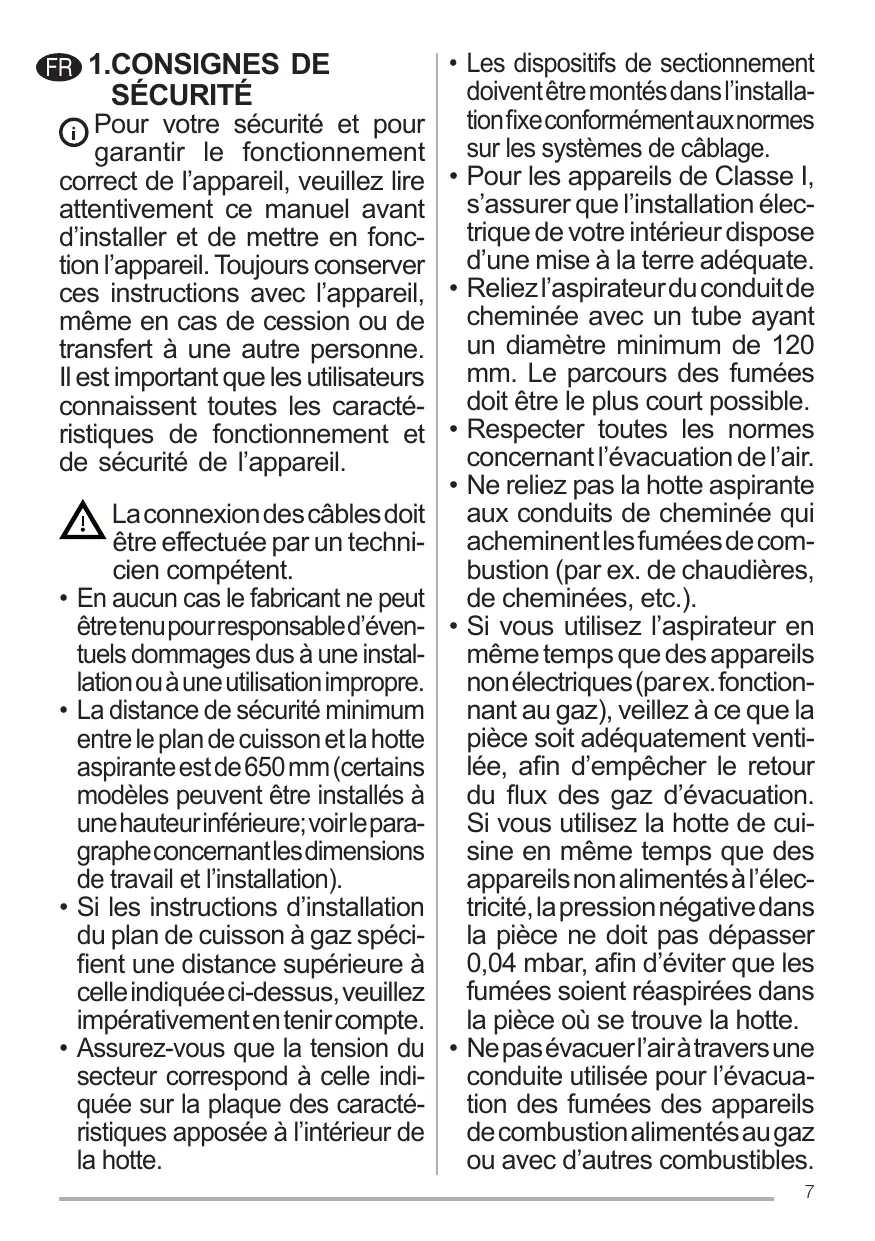 - Si vous utilisez l’aspirateur en même temps que des appareils non électriques (par ex. fonctionnant au gaz), veillez à ce que la pièce soit adéquatement ventilée, afin d’empêcher le retour du flux des gaz d’évacuation. Si vous utilisez la hotte de cuisine en même temps que des appareils non alimentés à l’électricité, la pression négative dans la pièce ne doit pas dépasser 0,04 mbar, afin d’éviter que les fumées soient réaspirées dans la pièce où se trouve la hotte.