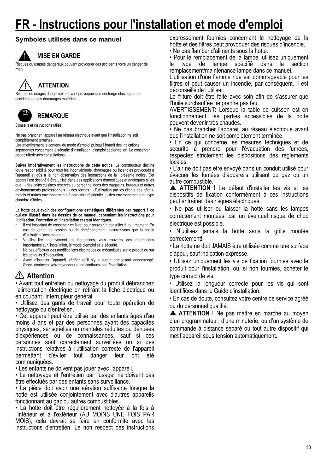 • Avant tout entretien ou nettoyage du produit débranchez l'alimentation électrique en retirant la fiche électrique ou en coupant l'interrupteur général. • Utilisez des gants de travail pour toute opération de nettoyage ou d'entretien. • Cet appareil peut être utilisé par des enfants âgés d’au moins 8 ans et par des personnes ayant des capacités physiques, sensorielles ou mentales réduites ou dénuées d’expériences ou de connaissances, sauf si ces personnes sont correctement surveillées ou si des instructions relatives à l'utilisation correcte de l'appareil permettant d'éviter tout danger leur ont été communiquées. • Les enfants ne doivent pas jouer avec l’appareil. • Le nettoyage et l’entretien par l’usager ne doivent pas être effectués par des enfants sans surveillance. • La pièce doit avoir une aération suffisante lorsque la hotte est utilisée conjointement avec d'autres appareils fonctionnant au gaz ou autres combustibles. • La hotte doit être régulièrement nettoyée à la fois à l'intérieur et à l'extérieur (AU MOINS UNE FOIS PAR MOIS); cela devrait se faire en conformité avec les instructions d'entretien. Le non respect des instructions