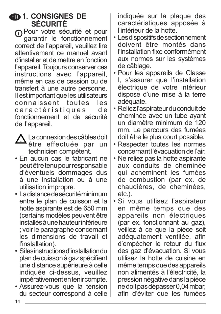 Les dispositifs de sectionnement doivent être montés dans l’installation fixe conformément aux normes sur les systèmes de câblage. Pour les appareils de Classe I, s’assurer que l’installation électrique de votre intérieur dispose d’une mise à la terre adéquate. Reliez l’aspirateur du conduit de cheminée avec un tube ayant un diamètre minimum de 120 mm. Le parcours des fumées doit être le plus court possible. Respecter toutes les normes concernant l’évacuation de l’air. Ne reliez pas la hotte aspirante aux conduits de cheminée qui acheminent les fumées de combustion (par ex. de chaudières, de cheminées, etc.). Si vous utilisez l’aspirateur en même temps que des appareils non électriques (par ex. fonctionnant au gaz), veillez à ce que la pièce soit adéquatement ventilée, afin d’empêcher le retour du flux des gaz d’évacuation. Si vous utilisez la hotte de cuisine en même temps que des appareils non alimentés à l’électricité, la pression négative dans la pièce ne doit pas dépasser 0,04 mbar, afin d’éviter que les fumées