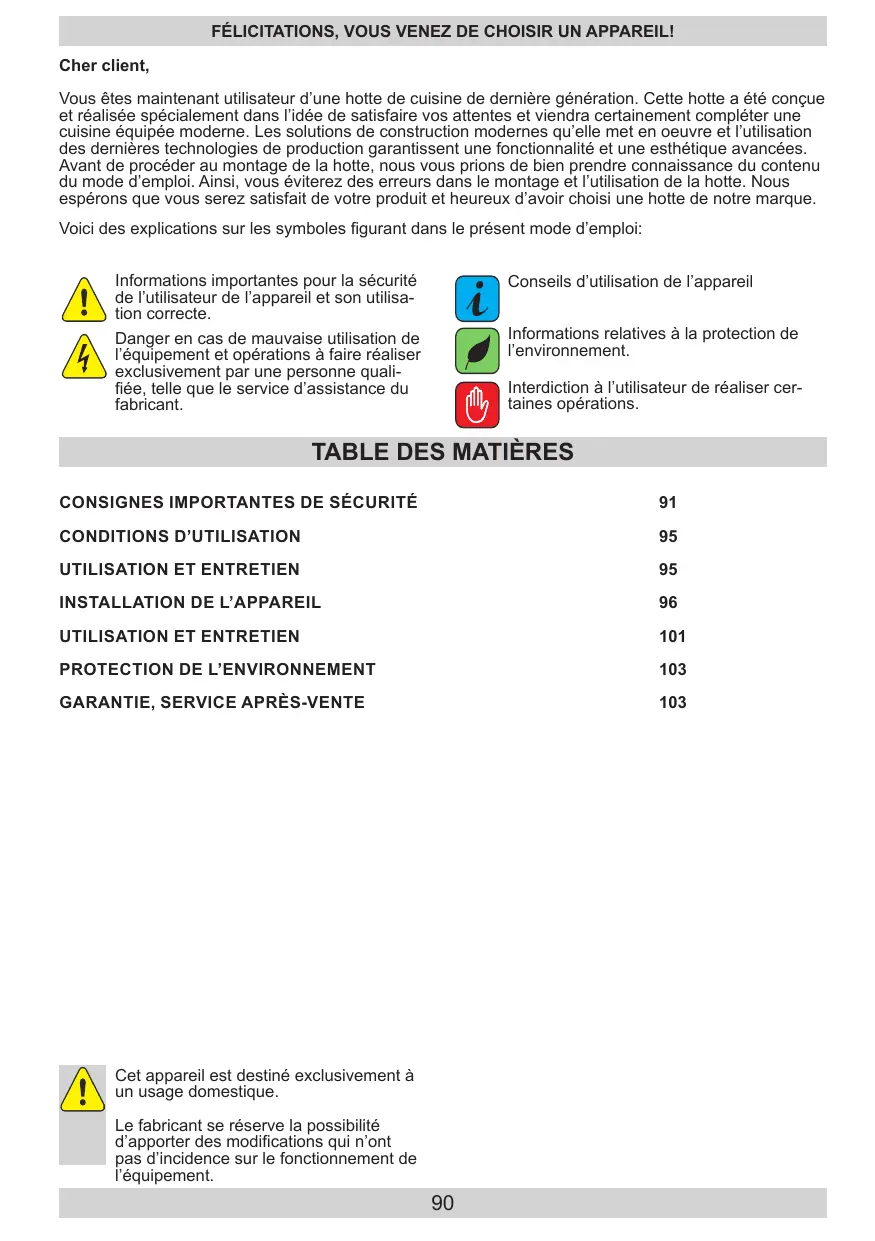 FÉLICITATIONS, VOUS VENEZ DE CHOISIR UN APPAREIL! Cher client, Vous êtes maintenant utilisateur d’une hotte de cuisine de dernière génération. Cette hotte a été conçue et réalisée spécialement dans l’idée de satisfaire vos attentes et viendra certainement compléter une cuisine équipée moderne. Les solutions de construction modernes qu’elle met en oeuvre et l’utilisation des dernières technologies de production garantissent une fonctionnalité et une esthétique avancées. Avant de procéder au montage de la hotte, nous vous prions de bien prendre connaissance du contenu du mode d’emploi. Ainsi, vous éviterez des erreurs dans le montage et l’utilisation de la hotte. Nous espérons que vous serez satisfait de votre produit et heureux d’avoir choisi une hotte de notre marque. Voici des explications sur les symboles figurant dans le présent mode d’emploi: Informations importantes pour la sécurité de l’utilisateur de l’appareil et son utilisation correcte. Danger en cas de mauvaise utilisation de l’équipement et opérations à faire réaliser exclusivement par une personne qualifiée, telle que le service d’assistance du fabricant.
