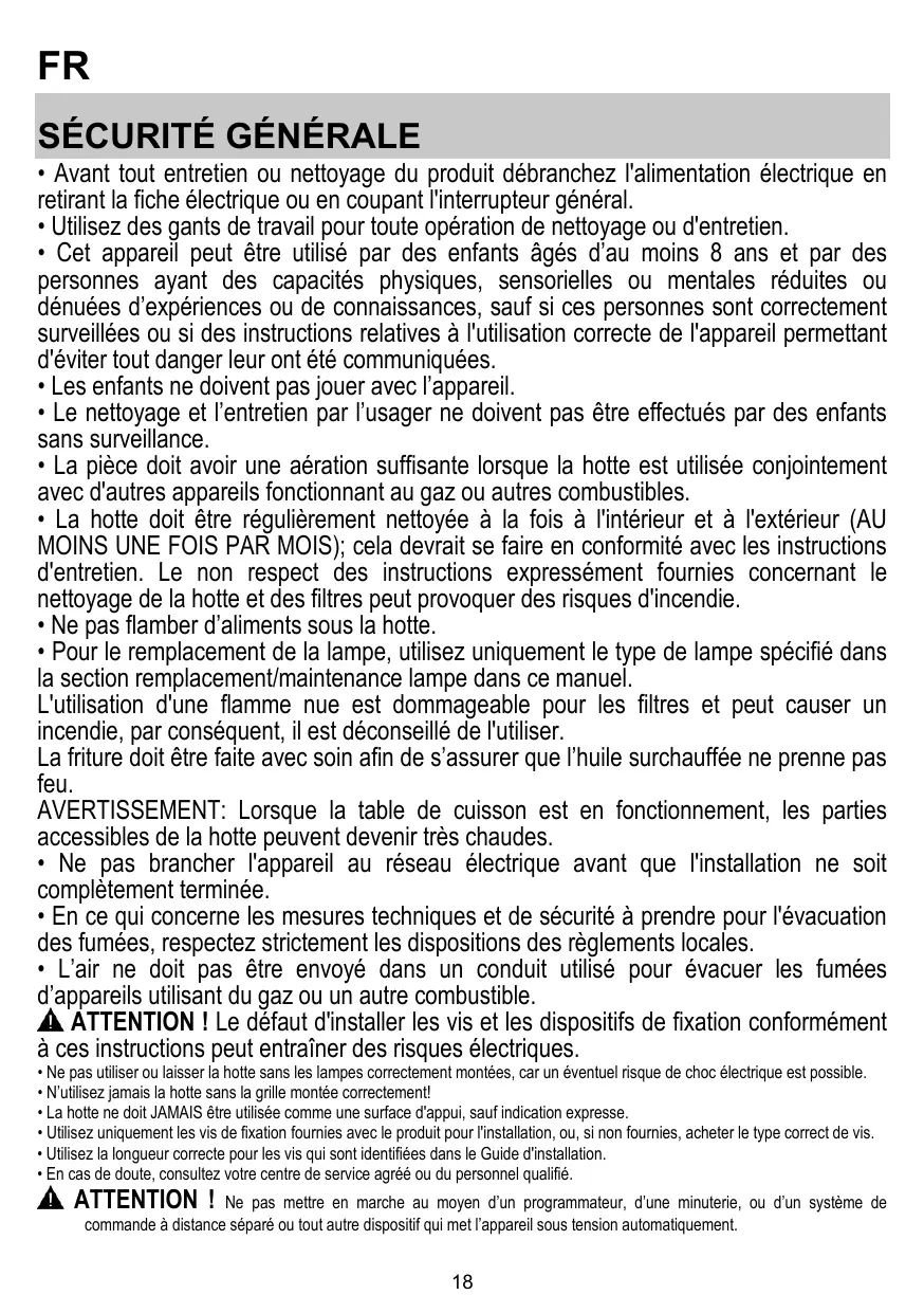 • Avant tout entretien ou nettoyage du produit débranchez l'alimentation électrique en retirant la fiche électrique ou en coupant l'interrupteur général. • Utilisez des gants de travail pour toute opération de nettoyage ou d'entretien. • Cet appareil peut être utilisé par des enfants âgés d’au moins 8 ans et par des personnes ayant des capacités physiques, sensorielles ou mentales réduites ou dénuées d’expériences ou de connaissances, sauf si ces personnes sont correctement surveillées ou si des instructions relatives à l'utilisation correcte de l'appareil permettant d'éviter tout danger leur ont été communiquées. • Les enfants ne doivent pas jouer avec l’appareil. • Le nettoyage et l’entretien par l’usager ne doivent pas être effectués par des enfants sans surveillance. • La pièce doit avoir une aération suffisante lorsque la hotte est utilisée conjointement avec d'autres appareils fonctionnant au gaz ou autres combustibles. • La hotte doit être régulièrement nettoyée à la fois à l'intérieur et à l'extérieur (AU MOINS UNE FOIS PAR MOIS); cela devrait se faire en conformité avec les instructions d'entretien. Le non respect des instructions expressément fournies concernant le nettoyage de la hotte et des filtres peut provoquer des risques d'incendie. • Ne pas flamber d’aliments sous la hotte. • Pour le remplacement de la lampe, utilisez uniquement le type de lampe spécifié dans la section remplacement/maintenance lampe dans ce manuel. L'utilisation d'une flamme nue est dommageable pour les filtres et peut causer un incendie, par conséquent, il est déconseillé de l'utiliser. La friture doit être faite avec soin afin de s’assurer que l’huile surchauffée ne prenne pas feu. AVERTISSEMENT: Lorsque la table de cuisson est en fonctionnement, les parties accessibles de la hotte peuvent devenir très chaudes. • Ne pas brancher l'appareil au réseau électrique avant que l'installation ne soit complètement terminée. • En ce qui concerne les mesures techniques et de sécurité à prendre pour l'évacuation des fumées, respectez strictement les dispositions des règlements locales. • L’air ne doit pas être envoyé dans un conduit utilisé pour évacuer les fumées d’appareils utilisant du gaz ou un autre combustible. ATTENTION ! Le défaut d'installer les vis et les dispositifs de fixation conformément à ces instructions peut entraîner des risques électriques.