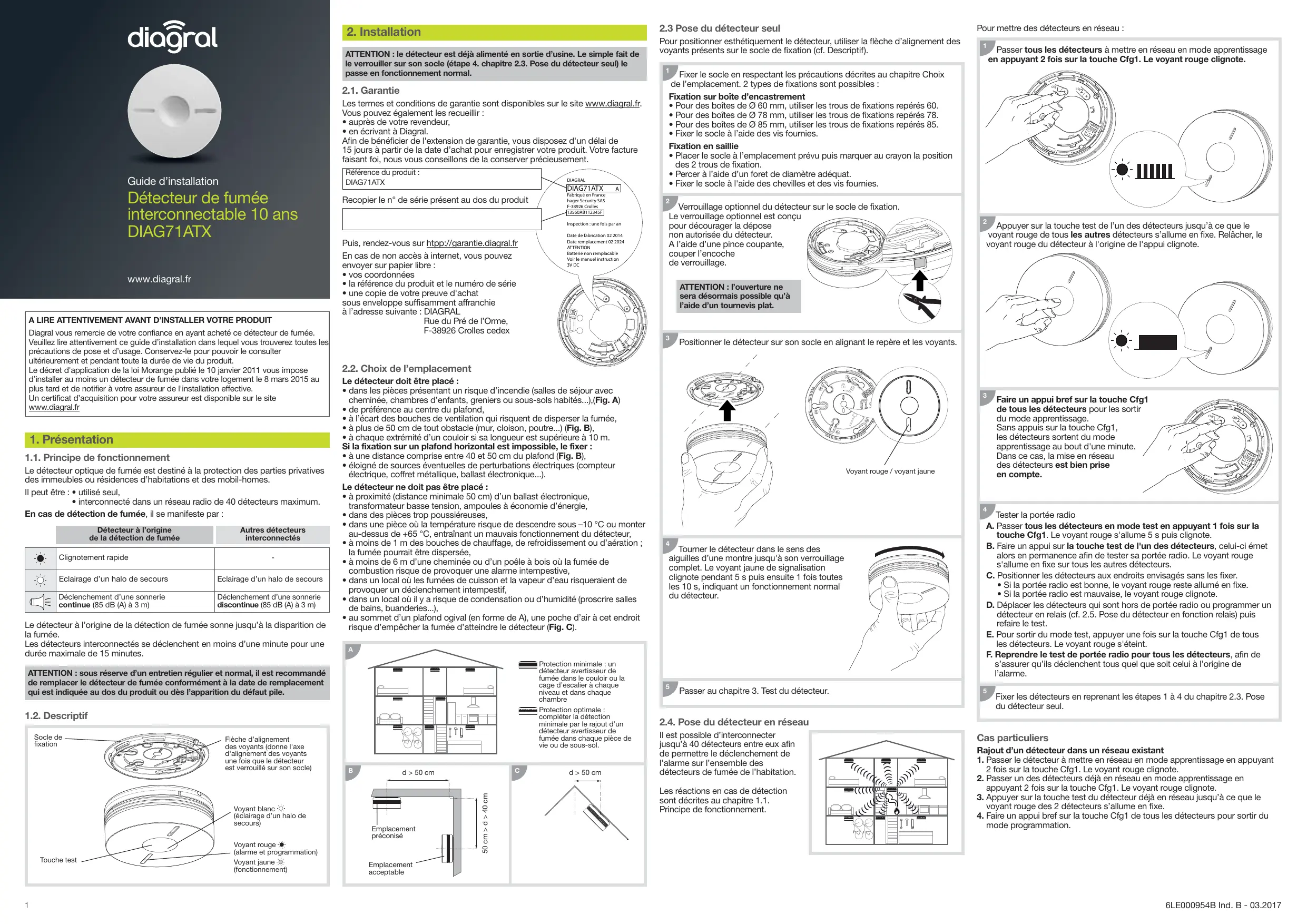 - en écrivant à Diagral. Afin de bénéficier de l'extension de garantie, vous disposez d'un délai de 15 jours à partir de la date d’achat pour enregistrer votre produit. Votre facture faisant foi, nous vous conseillons de la conserver précieusement. Référence du produit : DIAG71ATX A LIRE ATTENTIVEMENT AVANT D’INSTALLER VOTRE PRODUIT Diagral vous remercie de votre confiance en ayant acheté ce détecteur de fumée. Veuillez lire attentivement ce guide d’installation dans lequel vous trouverez toutes les précautions de pose et d’usage. Conservez-le pour pouvoir le consulter ultérieurement et pendant toute la durée de vie du produit. Le décret d'application de la loi Morange publié le 10 janvier 2011 vous impose d’installer au moins un détecteur de fumée dans votre logement le 8 mars 2015 au plus tard et de notifier à votre assureur de l'installation effective. Un certificat d’acquisition pour votre assureur est disponible sur le site www.diagral.fr