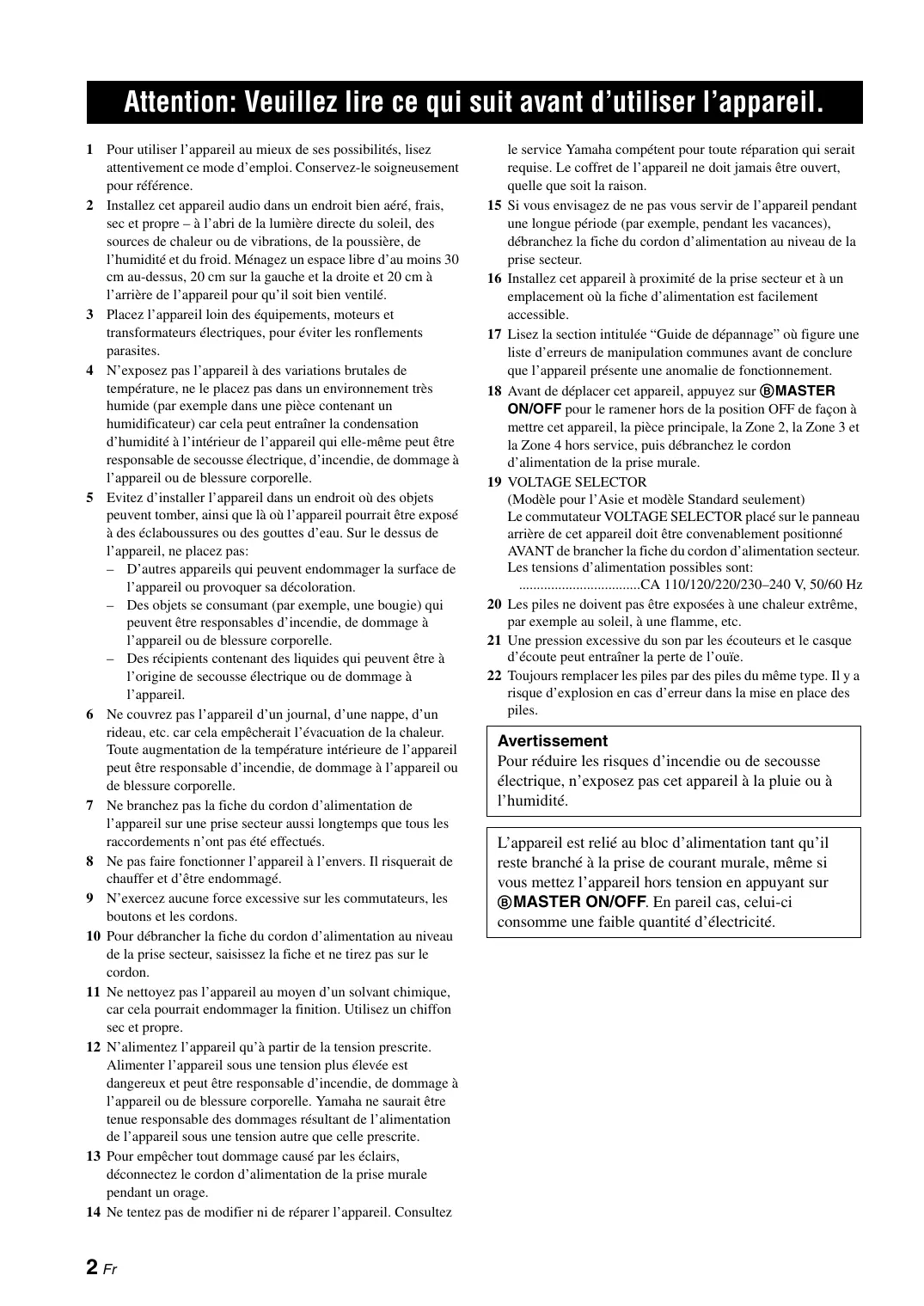 12 N'alimentez l'appareil qu'a partir de la tension prescrite. Alimenter l'appareil sous une tension plus elevée est dangereux et peut être responsable d'incendie, de dommage à l'appareil ou de blessure corporelle. Yamaha ne saurait être tenue responsable des dommages résultat de l'alimentation de l'appareil sous une tension autre que celle prescrite.