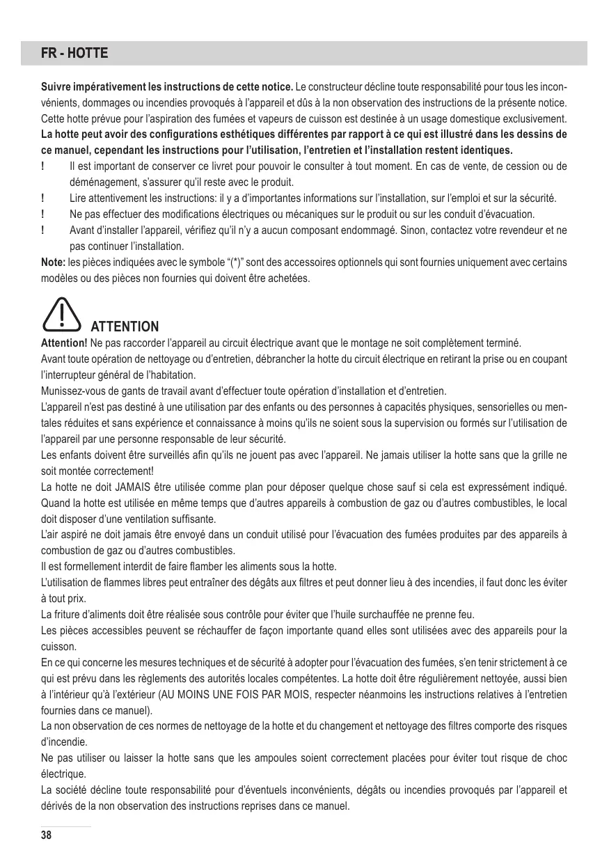 FR - HOTTE Suivre impérativement les instructions de cette notice. Le constructeur décline toute responsabilité pour tous les inconvénients, dommages ou incendies provoqués à l’appareil et dûs à la non observation des instructions de la présente notice. Cette hotte prévue pour l’aspiration des fumées et vapeurs de cuisson est destinée à un usage domestique exclusivement. La hotte peut avoir des configurations esthétiques différentes par rapport à ce qui est illustré dans les dessins de ce manuel, cependant les instructions pour l’utilisation, l’entretien et l’installation restent identiques. !! Il est important de conserver ce livret pour pouvoir le consulter à tout moment. En cas de vente, de cession ou de déménagement, s’assurer qu’il reste avec le produit. !! Lire attentivement les instructions: il y a d’importantes informations sur l’installation, sur l’emploi et sur la sécurité. !! Ne pas effectuer des modifications électriques ou mécaniques sur le produit ou sur les conduit d’évacuation. !! Avant d’installer l’appareil, vérifiez qu’il n’y a aucun composant endommagé. Sinon, contactez votre revendeur et ne pas continuer l’installation. Note: les pièces indiquées avec le symbole “(*)” sont des accessoires optionnels qui sont fournies uniquement avec certains modèles ou des pièces non fournies qui doivent être achetées.
