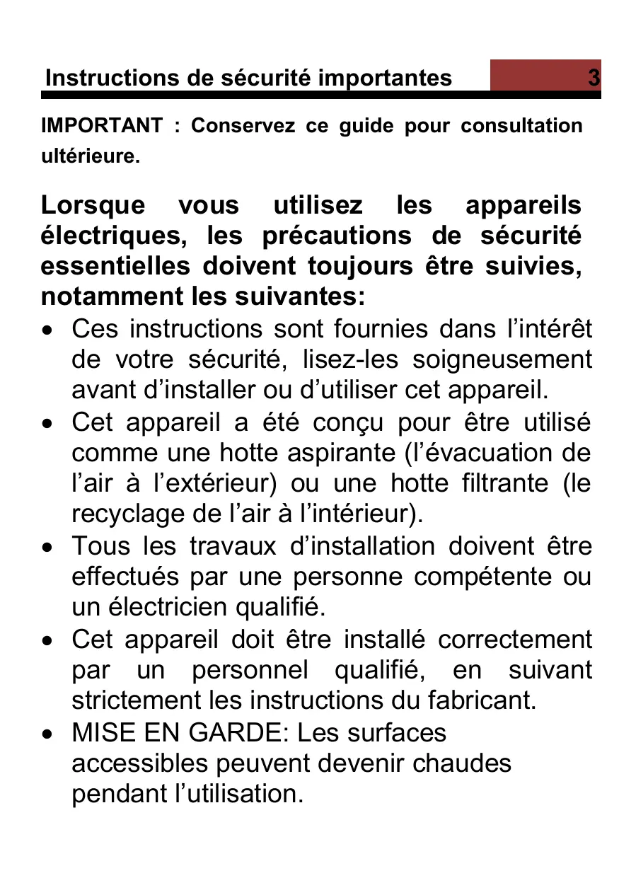 IMPORTANT : Conservez ce guide pour consultation ultérieure. Lorsque vous utilisez les appareils électriques, les précautions de sécurité essentielles doivent toujours être suivies, notamment les suivantes: Ces instructions sont fournies dans l’intérêt de votre sécurité, lisez-les soigneusement avant d’installer ou d’utiliser cet appareil. Cet appareil a été conçu pour être utilisé comme une hotte aspirante (l’évacuation de l’air à l’extérieur) ou une hotte filtrante (le recyclage de l’air à l’intérieur). Tous les travaux d’installation doivent être effectués par une personne compétente ou un électricien qualifié. Cet appareil doit être installé correctement par un personnel qualifié, en suivant strictement les instructions du fabricant. MISE EN GARDE: Les surfaces accessibles peuvent devenir chaudes pendant l’utilisation. Instructions de sécurité importantes