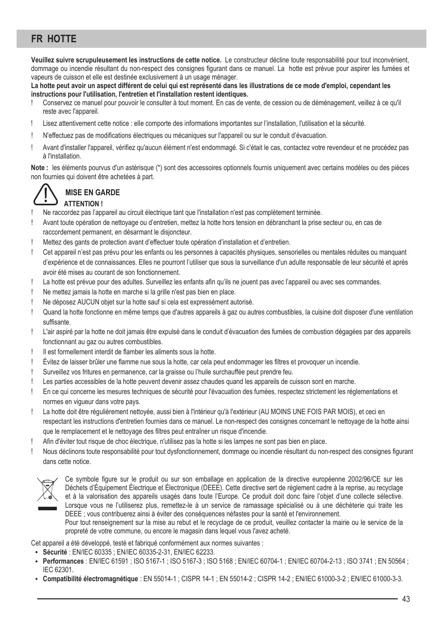 ! ! Cet appareil n’est pas prévu pour les enfants ou les personnes à capacités physiques, sensorielles ou mentales réduites ou manquant d’expérience et de connaissances. Elles ne pourront l’utiliser que sous la surveillance d'un adulte responsable de leur sécurité et après avoir été mises au courant de son fonctionnement. La hotte est prévue pour des adultes. Surveillez les enfants afin qu’ils ne jouent pas avec l’appareil ou avec ses commandes. Ne mettez jamais la hotte en marche si la grille n'est pas bien en place. Ne déposez AUCUN objet sur la hotte sauf si cela est expressément autorisé. Quand la hotte fonctionne en même temps que d'autres appareils à gaz ou autres combustibles, la cuisine doit disposer d'une ventilation suffisante. L'air aspiré par la hotte ne doit jamais être expulsé dans le conduit d’évacuation des fumées de combustion dégagées par des appareils fonctionnant au gaz ou autres combustibles. Il est formellement interdit de flamber les aliments sous la hotte. Évitez de laisser brûler une flamme nue sous la hotte, car cela peut endommager les filtres et provoquer un incendie. Surveillez vos fritures en permanence, car la graisse ou l’huile surchauffée peut prendre feu. Les parties accessibles de la hotte peuvent devenir assez chaudes quand les appareils de cuisson sont en marche. En ce qui concerne les mesures techniques de sécurité pour l'évacuation des fumées, respectez strictement les réglementations et normes en vigueur dans votre pays. La hotte doit être régulièrement nettoyée, aussi bien à l'intérieur qu'à l'extérieur (AU MOINS UNE FOIS PAR MOIS), et ceci en respectant les instructions d'entretien fournies dans ce manuel. Le non-respect des consignes concernant le nettoyage de la hotte ainsi que le remplacement et le nettoyage des filtres peut entraîner un risque d'incendie. Afin d'éviter tout risque de choc électrique, n'utilisez pas la hotte si les lampes ne sont pas bien en place. Nous déclinons toute responsabilité pour tout dysfonctionnement, dommage ou incendie résultant du non-respect des consignes figurant dans cette notice. Ce symbole figure sur le produit ou sur son emballage en application de la directive européenne 2002/96/CE sur les Déchets d’Équipement Électrique et Électronique (DEEE). Cette directive sert de règlement cadre à la reprise, au recyclage et à la valorisation des appareils usagés dans toute l’Europe. Ce produit doit donc faire l’objet d’une collecte sélective. Lorsque vous ne l’utiliserez plus, remettez-le à un service de ramassage spécialisé ou à une déchèterie qui traite les DEEE ; vous contribuerez ainsi à éviter des conséquences néfastes pour la santé et l'environnement. Pour tout renseignement sur la mise au rebut et le recyclage de ce produit, veuillez contacter la mairie ou le service de la propreté de votre commune, ou encore le magasin dans lequel vous l'avez acheté.
