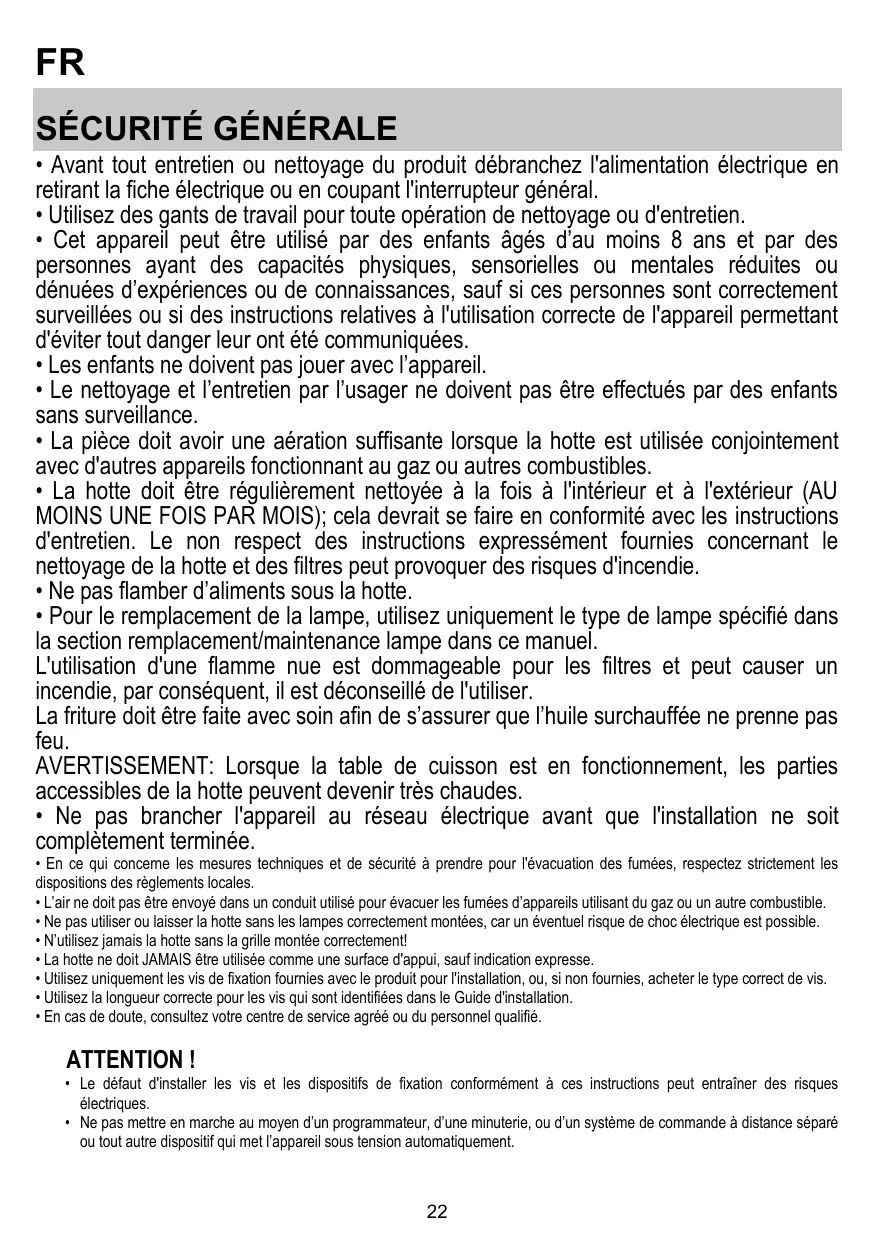 FR SÉCURITÉ GÉNÉRALE • Avant tout entretien ou nettoyage du produit débranchez l'alimentation électrique en retirant la fiche électrique ou en coupant l'interrupteur général. • Utilisez des gants de travail pour toute opération de nettoyage ou d'entretien. • Cet appareil peut être utilisé par des enfants âgés d’au moins 8 ans et par des personnes ayant des capacités physiques, sensorielles ou mentales réduites ou dénuées d’expériences ou de connaissances, sauf si ces personnes sont correctement surveillées ou si des instructions relatives à l'utilisation correcte de l'appareil permettant d'éviter tout danger leur ont été communiquées. • Les enfants ne doivent pas jouer avec l’appareil. • Le nettoyage et l’entretien par l’usager ne doivent pas être effectués par des enfants sans surveillance. • La pièce doit avoir une aération suffisante lorsque la hotte est utilisée conjointement avec d'autres appareils fonctionnant au gaz ou autres combustibles. • La hotte doit être régulièrement nettoyée à la fois à l'intérieur et à l'extérieur (AU MOINS UNE FOIS PAR MOIS); cela devrait se faire en conformité avec les instructions d'entretien. Le non respect des instructions expressément fournies concernant le nettoyage de la hotte et des filtres peut provoquer des risques d'incendie. • Ne pas flamber d’aliments sous la hotte. • Pour le remplacement de la lampe, utilisez uniquement le type de lampe spécifié dans la section remplacement/maintenance lampe dans ce manuel. L'utilisation d'une flamme nue est dommageable pour les filtres et peut causer un incendie, par conséquent, il est déconseillé de l'utiliser. La friture doit être faite avec soin afin de s’assurer que l’huile surchauffée ne prenne pas feu. AVERTISSEMENT: Lorsque la table de cuisson est en fonctionnement, les parties accessibles de la hotte peuvent devenir très chaudes. • Ne pas brancher l'appareil au réseau électrique avant que l'installation ne soit complètement terminée. • En ce qui concerne les mesures techniques et de sécurité à prendre pour l'évacuation des fumées, respectez strictement les dispositions des règlements locales. • L’air ne doit pas être envoyé dans un conduit utilisé pour évacuer les fumées d’appareils utilisant du gaz ou un autre combustible. • Ne pas utiliser ou laisser la hotte sans les lampes correctement montées, car un éventuel risque de choc électrique est possible. • N’utilisez jamais la hotte sans la grille montée correctement! • La hotte ne doit JAMAIS être utilisée comme une surface d'appui, sauf indication expresse. • Utilisez uniquement les vis de fixation fournies avec le produit pour l'installation, ou, si non fournies, acheter le type correct de vis. • Utilisez la longueur correcte pour les vis qui sont identifiées dans le Guide d'installation. • En cas de doute, consultez votre centre de service agréé ou du personnel qualifié.