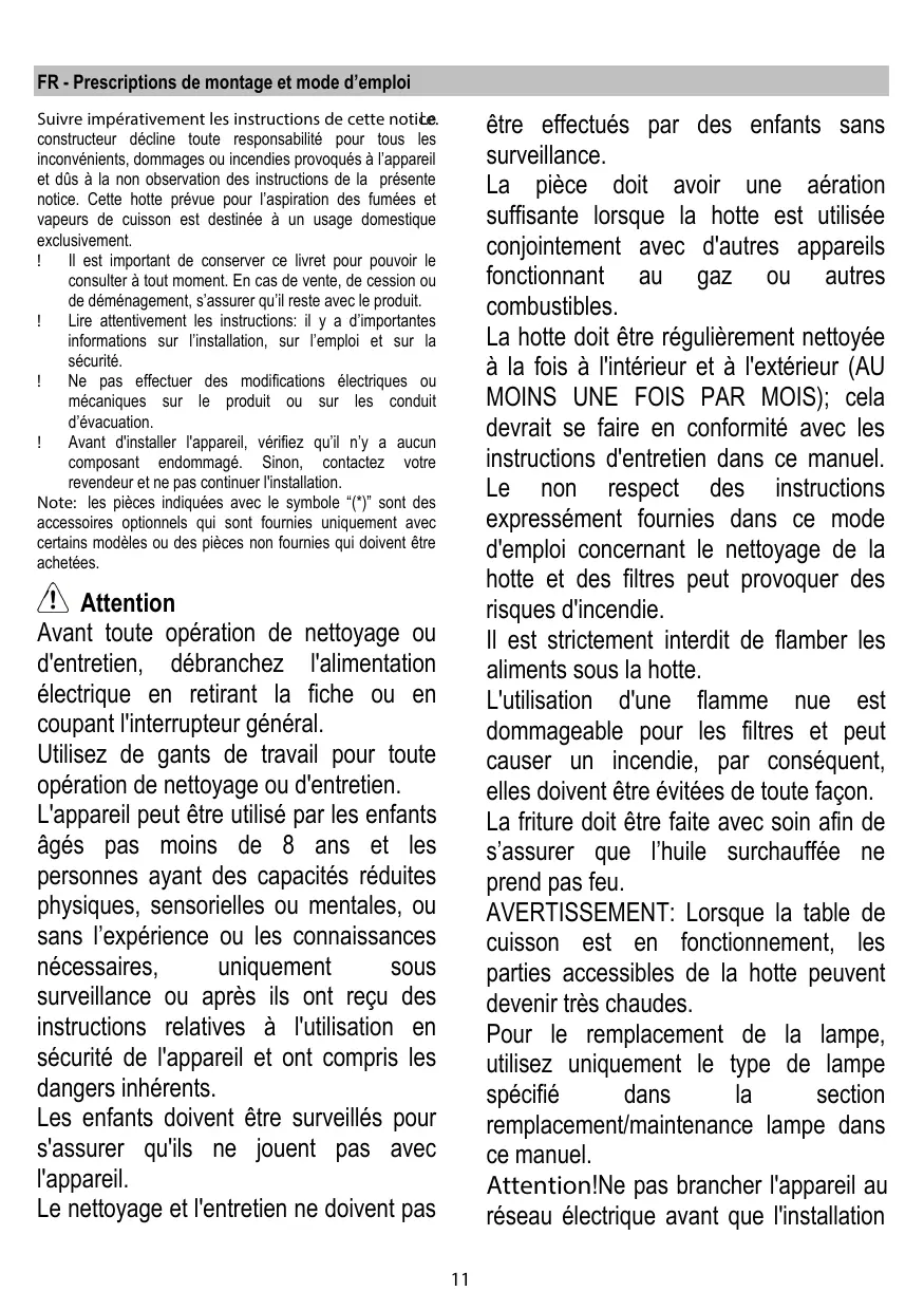 Le constructeur décline toute responsabilité pour tous les inconvénients, dommages ou incendies provoqués à l’appareil et dûs à la non observation des instructions de la présente notice. Cette hotte prévue pour l’aspiration des fumées et vapeurs de cuisson est destinée à un usage domestique exclusivement. ! Il est important de conserver ce livret pour pouvoir le consulter à tout moment. En cas de vente, de cession ou de déménagement, s’assurer qu’il reste avec le produit. ! Lire attentivement les instructions: il y a d’importantes informations sur l’installation, sur l’emploi et sur la sécurité. ! Ne pas effectuer des modifications électriques ou mécaniques sur le produit ou sur les conduit d’évacuation. ! Avant d'installer l'appareil, vérifiez qu’il n’y a aucun composant endommagé. Sinon, contactez votre revendeur et ne pas continuer l'installation. Note: les pièces indiquées avec le symbole “(*)” sont des accessoires optionnels qui sont fournies uniquement avec certains modèles ou des pièces non fournies qui doivent être achetées.