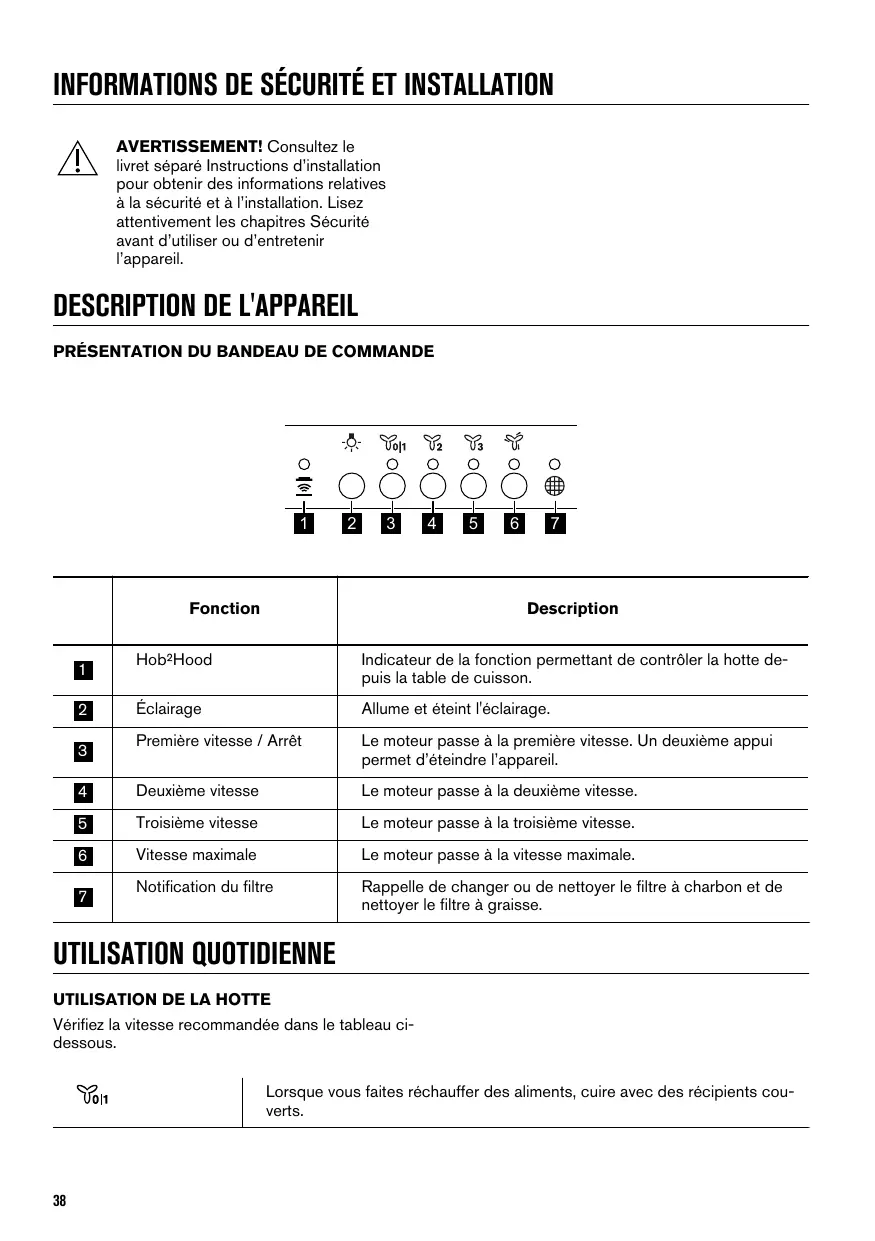 UTILISATION QUOTIDIENNE UTILISATION DE LA HOTTE Vérifiez la vitesse recommandée dans le tableau cidessous.