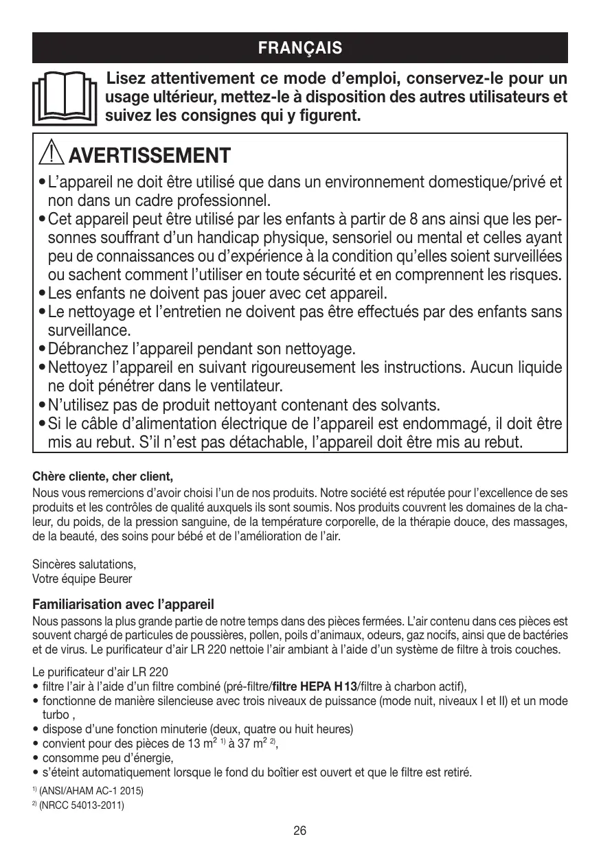 - Si le câble d’alimentation électrique de l’appareil est endommagé, il doit être mis au rebut. S’il n’est pas détachable, l’appareil doit être mis au rebut. Chère cliente, cher client, Nous vous remercions d’avoir choisi l’un de nos produits. Notre société est réputée pour l’excellence de ses produits et les contrôles de qualité auxquels ils sont soumis. Nos produits couvrent les domaines de la chaleur, du poids, de la pression sanguine, de la température corporelle, de la thérapie douce, des massages, de la beauté, des soins pour bébé et de l’amélioration de l’air. Sincères salutations, Votre équipe Beurer Familiarisation avec l’appareil Nous passons la plus grande partie de notre temps dans des pièces fermées. L’air contenu dans ces pièces est souvent chargé de particules de poussières, pollen, poils d’animaux, odeurs, gaz nocifs, ainsi que de bactéries et de virus. Le purificateur d’air LR 220 nettoie l’air ambiant à l’aide d’un système de filtre à trois couches. Le purificateur d’air LR 220