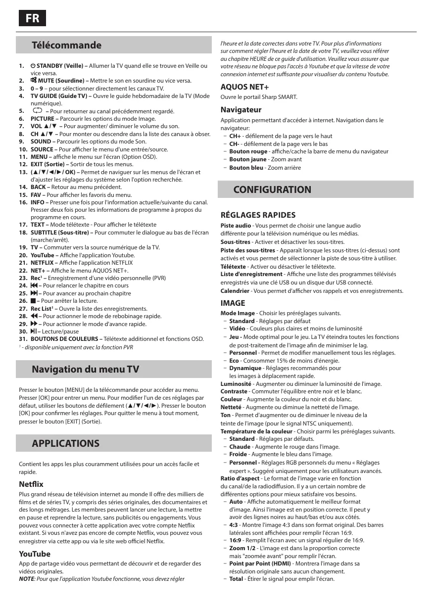 2. MUTE (Sourdine) – Mettre le son en sourdine ou vice versa. 3. 0 – 9 – pour sélectionner directement les canaux TV. 4. TV GUIDE (Guide TV) – Ouvre le guide hebdomadaire de la TV (Mode numérique). 5. – Pour retourner au canal précédemment regardé. 6. PICTURE – Parcourir les options du mode Image. 7. VOL ▲/▼ – Pour augmenter/ diminuer le volume du son. 8. CH ▲/▼ – Pour monter ou descendre dans la liste des canaux à obser. 9. SOUND – Parcourir les options du mode Son. 10. SOURCE – Pour afficher le menu d'une entrée/source. 11. MENU – affiche le menu sur l'écran (Option OSD). 12. EXIT (Sortie) – Sortir de tous les menus. 13. (▲/▼/◄/►/ OK) – Permet de naviguer sur les menus de l'écran et d'ajuster les réglages du système selon l'option recherchée. 14. BACK – Retour au menu précédent. 15. FAV – Pour afficher les favoris du menu. 16. INFO – Presser une fois pour l'information actuelle/suivante du canal. Presser deux fois pour les informations de programme à propos du programme en cours. 17. TEXT – Mode télétexte - Pour afficher le télétexte 18. SUBTITLE (Sous-titre) – Pour commuter le dialogue au bas de l'écran (marche/arrêt). 19. TV – Commuter vers la source numérique de la TV. 20. YouTube – Affiche l'application Youtube. 21. NETFLIX – Affiche l'application NETFLIX 22. NET+ – Affiche le menu AQUOS NET+. 23. Rec1 – Enregistrement d'une vidéo personnelle (PVR) 24. – Pour relancer le chapitre en cours 25. – Pour avancer au prochain chapitre 26. – Pour arrêter la lecture. 27. Rec List1 – Ouvre la liste des enregistrements. 28. – Pour actionner le mode de rebobinage rapide. 29. – Pour actionner le mode d'avance rapide. 30. – Lecture/pause 31. BOUTONS DE COULEURS – Télétexte additionnel et fonctions OSD. 1