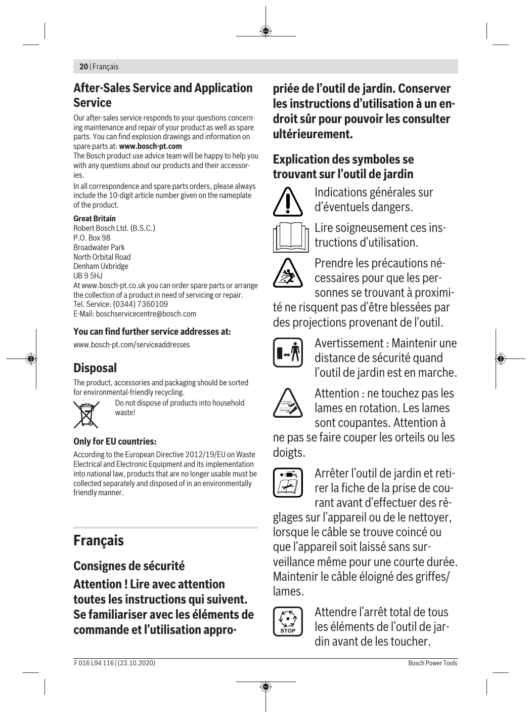 Remarque concernant les produits non commercialisés en GB : ATTENTION : Pour votre propre sécurité, il est nécessaire que la fiche montée sur l’outil soit raccordée à la rallonge. Le dispositif de couplage de la rallonge doit être protégé contre les projections d’eau, être en caoutchouc ou être recouvert de caoutchouc. La rallonge doit être utilisée avec un serre-câble. Entretien u Toujours porter des gants de jardin lors de la manipulation ou le travail près des griffes/lames aiguës. u Vérifiez si tous les écrous, boulons et vis sont bien serrés pour prévenir de tout risque d’accident et garantir un bon fonctionnement du produit. u Contrôler régulièrement le bac de ramassage pour s’assurer de son état d’usure. u Contrôlez le produit et, pour des raisons de sécurité, remplacez les pièces usées ou endommagées. u Veillez à ce que les pièces de rechange soient des pièces d’origine Bosch. u Avant de transporter ou de stocker le produit, assurez-vous qu’il est propre et bien entretenu. Si nécessaire, nettoyez-le à l’aide d’une brosse sèche et douce. F 016 L94 116 | (23.10.2020)