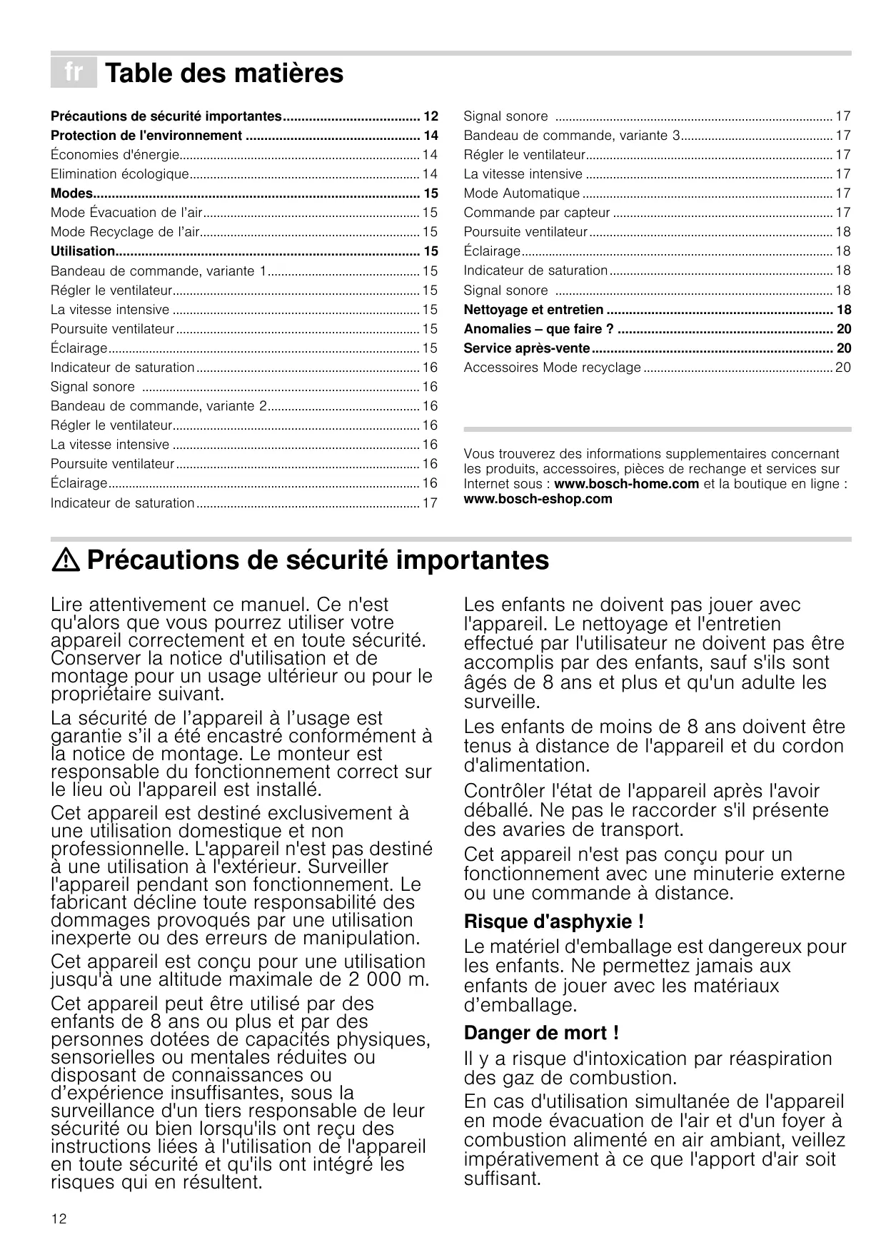 Précautions de sécurité importantes 12 Protection de l'environnement 14 Économies d'énergie 14 Elimination écologique 14 Modes 15 Mode Évacuation de l’air 15 Mode Recyclage de l’air 15 Utilisation 15 Bandeau de commande, variante 1 15 Régler le ventilateur 15 La vitesse intensive 15 Poursuite ventilateur 15 Éclairage 15 Indicateur de saturation 16 Signal sonore 16 Bandeau de commande, variante 2 16 Régler le ventilateur 16 La vitesse intensive 16 Poursuite ventilateur 16 Éclairage 16 Indicateur de saturation 17