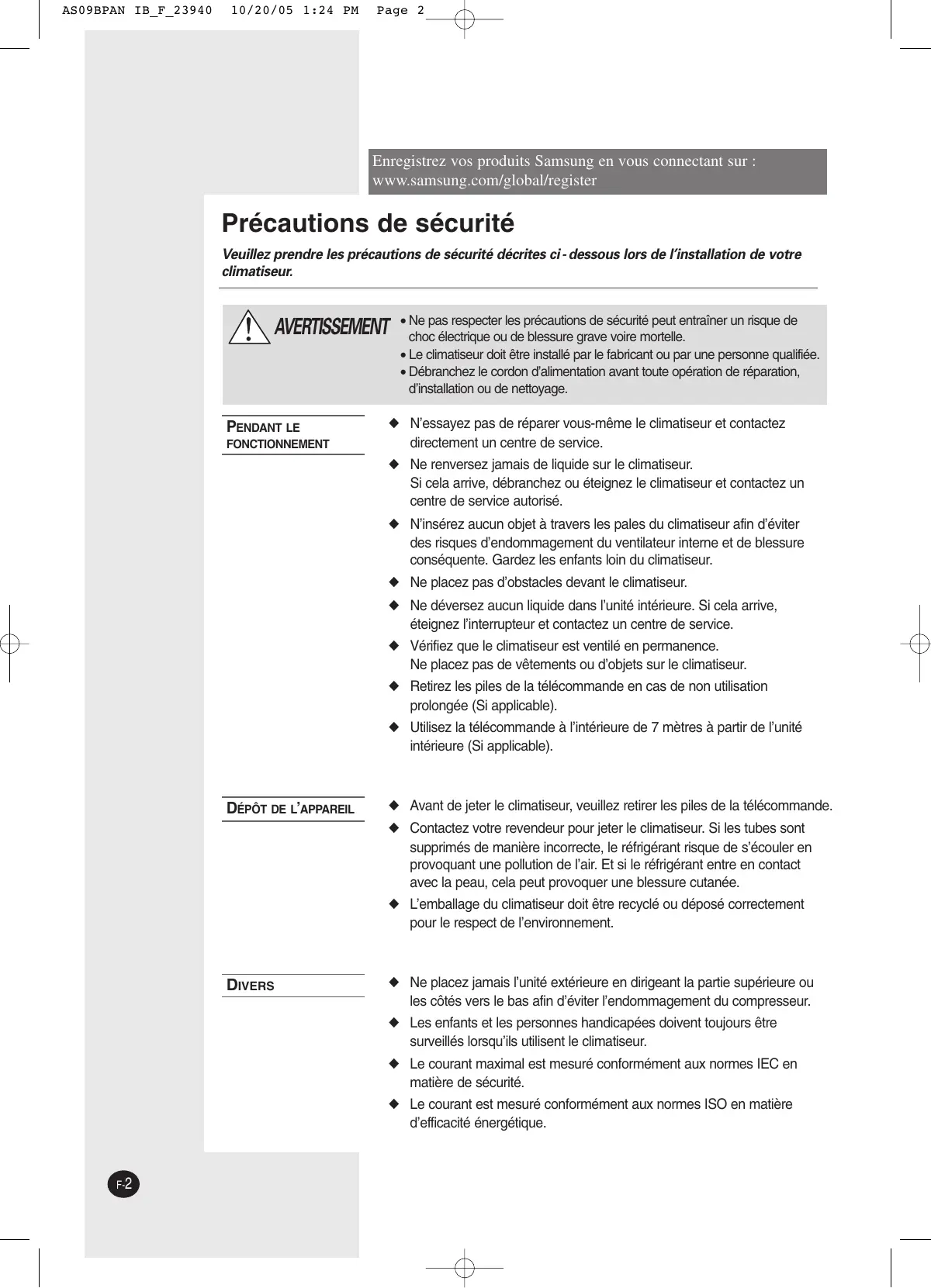 10/20/05 1:24 PM Page 2 Enregistrez vos produits Samsung en vous connectant sur : www.samsung.com/global/register Précautions de sécurité Veuillez prendre les précautions de sécurité décrites ci - dessous lors de l’installation de votre climatiseur. AVERTISSEMENT PENDANT LE FONCTIONNEMENT