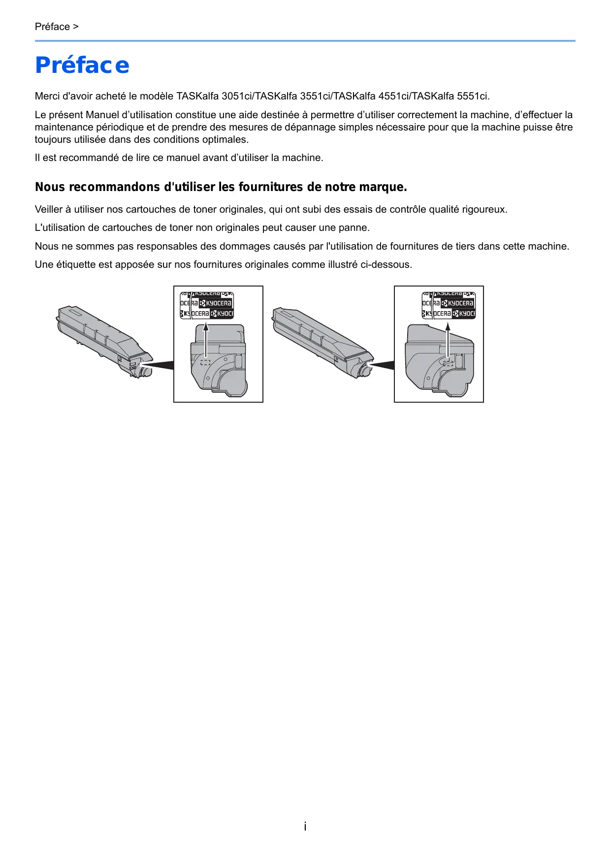 TASKalfa 3051ci TASKalfa 3551ci TASKalfa 4551ci TASKalfa 5551ci Préface > Préface Merci d'avoir acheté le modèle TASKalfa 3051ci/TASKalfa 3551ci/TASKalfa 4551ci/TASKalfa 5551ci. Le présent Manuel d’utilisation constitue une aide destinée à permettre d’utiliser correctement la machine, d’effectuer la maintenance périodique et de prendre des mesures de dépannage simples nécessaire pour que la machine puisse être toujours utilisée dans des conditions optimales. Il est recommandé de lire ce manuel avant d’utiliser la machine. Nous recommandons d'utiliser les fournitures de notre marque. Veiller à utiliser nos cartouches de toner originales, qui ont subi des essais de contrôle qualité rigoureux. L'utilisation de cartouches de toner non originales peut causer une panne. Nous ne sommes pas responsables des dommages causés par l'utilisation de fournitures de tiers dans cette machine. Une étiquette est apposée sur nos fournitures originales comme illustré ci-dessous.