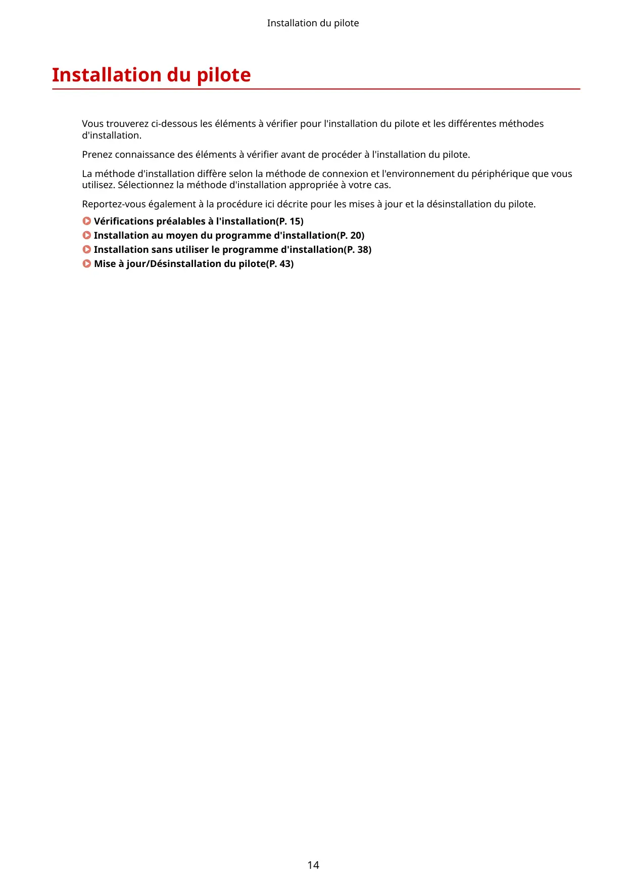 Installation du pilote Installation du pilote Vous trouverez ci-dessous les éléments à vérifier pour l'installation du pilote et les différentes méthodes d'installation. Prenez connaissance des éléments à vérifier avant de procéder à l'installation du pilote. La méthode d'installation diffère selon la méthode de connexion et l'environnement du périphérique que vous utilisez. Sélectionnez la méthode d'installation appropriée à votre cas. Reportez-vous également à la procédure ici décrite pour les mises à jour et la désinstallation du pilote. Vérifications préalables à l'installation(P. 15) Installation au moyen du programme d'installation(P. 20) Installation sans utiliser le programme d'installation(P. 38) Mise à jour/Désinstallation du pilote(P. 43)